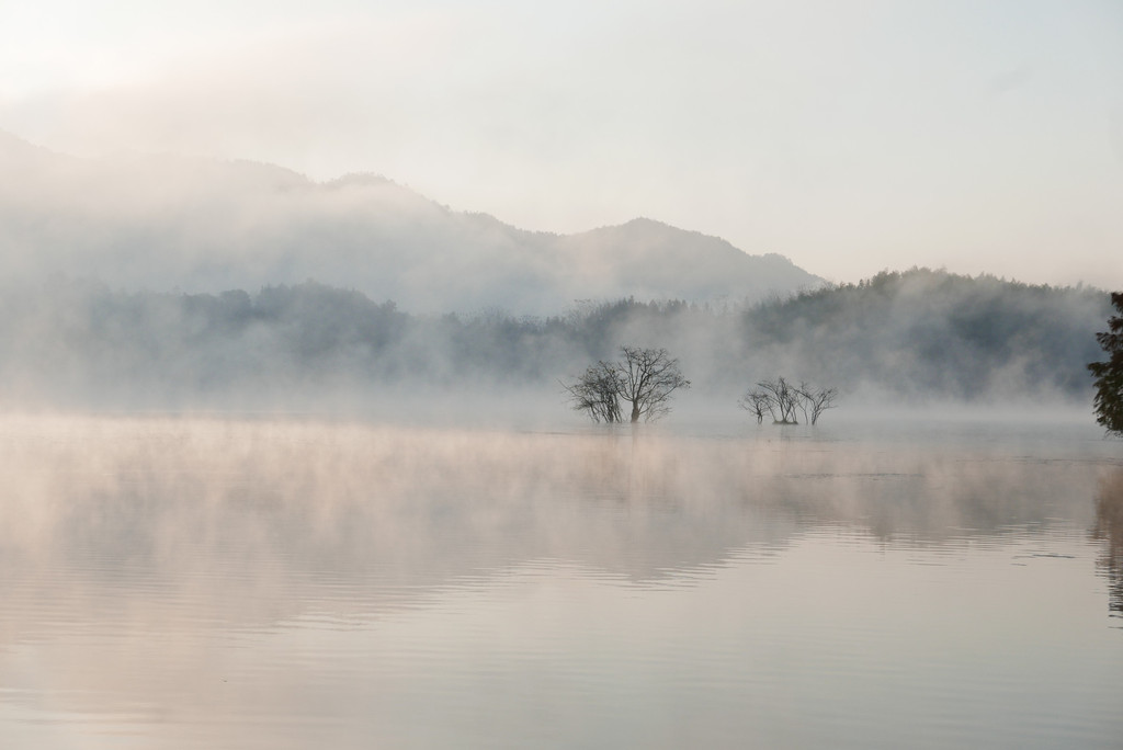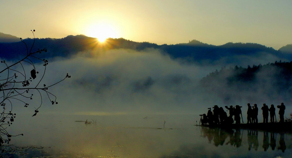 周围群山环抱,层峦叠嶂,野花竞相开放; 湖面开阔平静,飞鸟回翔,四周风光旖旎、人文景致极其丰富。日出时眼前呈现出一幅幅水墨画,日落时宁静安详,绝美!