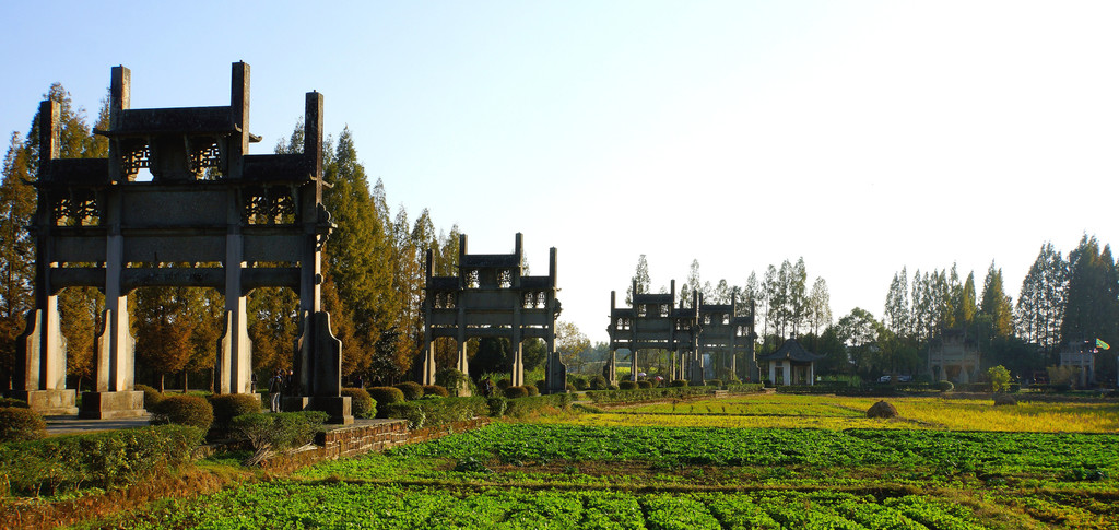 棠樾牌坊群—— 位于安徽省歙(she)县郑村镇棠樾村东大道上,为明清时期古徽州建筑艺术的代表作。棠樾的七连座牌坊群,体现了徽文化程朱理学"忠、孝、节、义"伦理道德的概貌,也包括了内涵极为丰富的"以人为本"的人文历史,同时亦是徽商纵横商界三百余年的重要见证。每一座牌坊都有一个情感交织的动人故事。乾隆皇帝下江南的时候,曾大大褒奖牌坊的主人鲍氏家族,称其为"慈孝天下无双里,衮绣江南第一乡"
