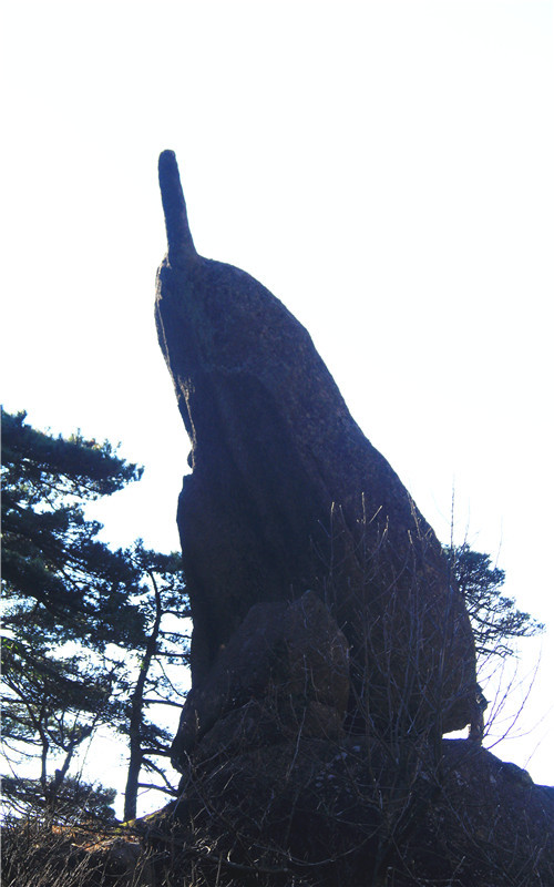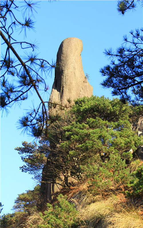 黄山梦笔生花由于孤峰的上部1/3处横裂,裂缝以上部分渐圆渐尖,形如蘸满浓墨的笔尖,而下部2/3的石柱恰似笔杆。