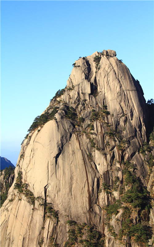 玉屏峰介于天都、莲花峰间,为36小峰之一,海拔1716米。峰壁如玉雕屏障,故名玉屏峰。