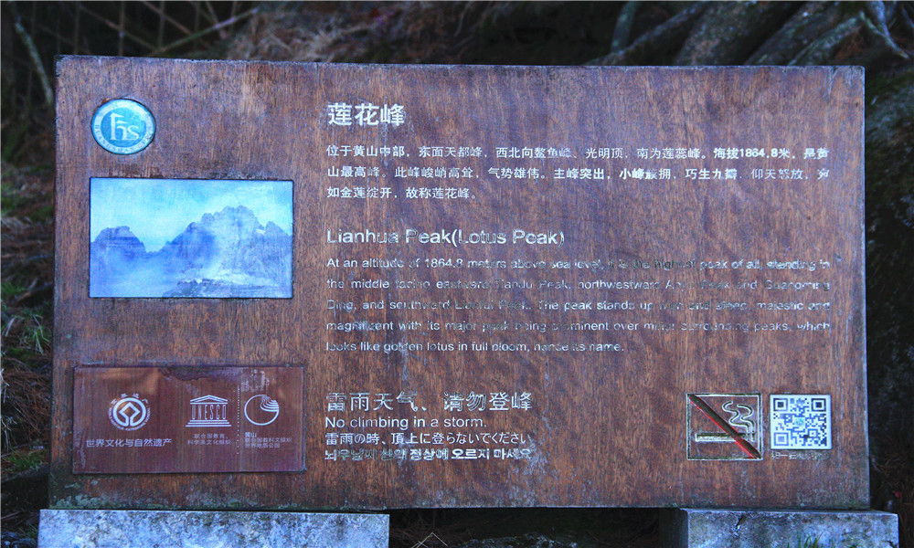 黄山最高的高峰,海拔1864.8米。从莲花岭到莲花峰顶的1.5公里路上,沿途有飞龙松、倒挂松等名松及黄山杜鹃。