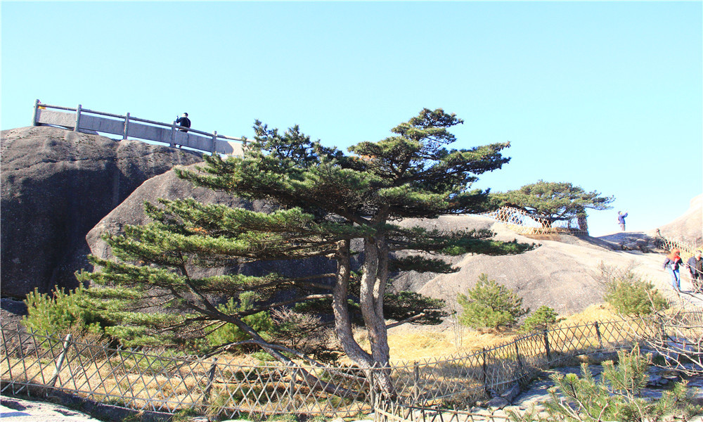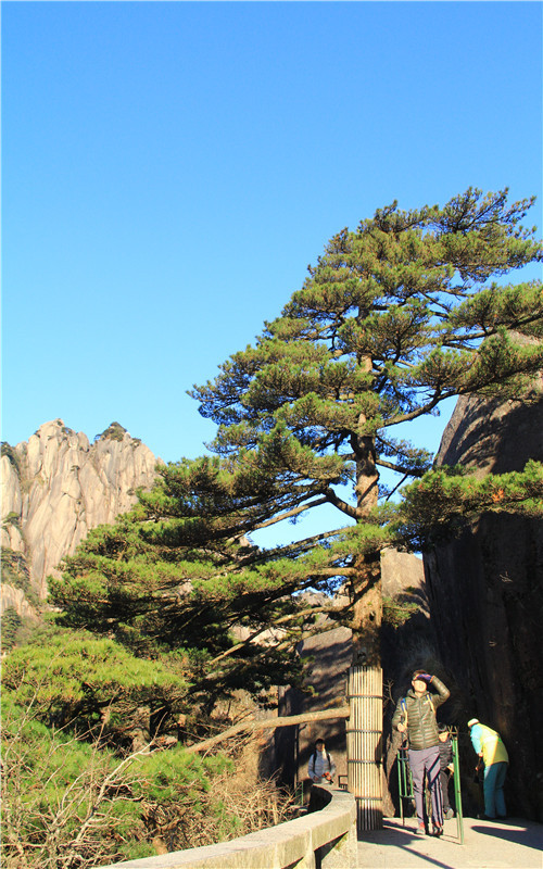 迎客松姿态优美 ,枝干遒劲,虽然饱经风霜,却仍然郁郁苍苍,充满生机。