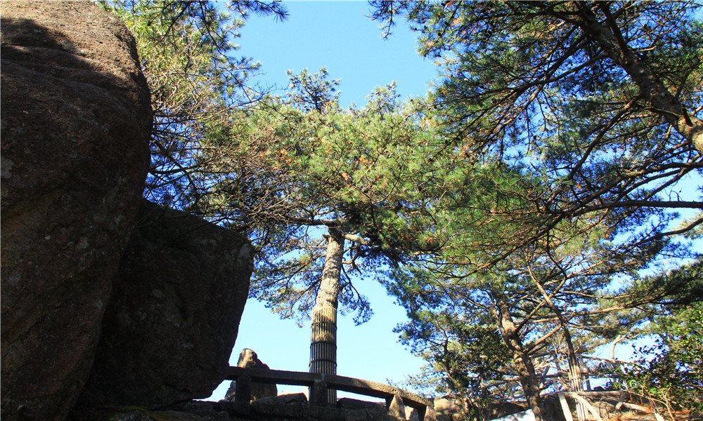 玉屏峰前有巨石如平台,左有青狮石、迎客松、右有白象石、送客松、立雪台。
