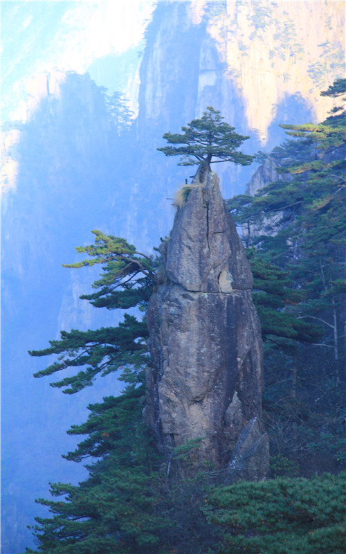 黄山梦笔生花坐落于黄山北海景区的散花坞内,海拔1600多米,孤峰耸立。