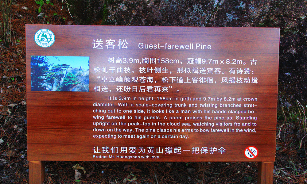 迎客松恰似一位好客的主人,挥展双臂,热情欢迎海内外宾客来黄山游览。此松是黄山松的代表,国之瑰宝。北京人民大会堂安徽厅陈列的巨幅铁画《迎客松》就是根据它的形象制作的。