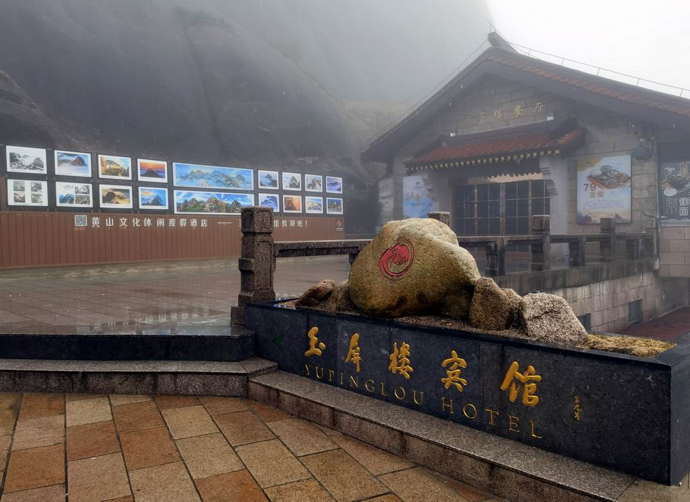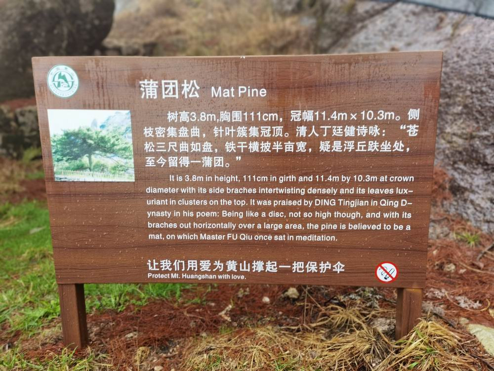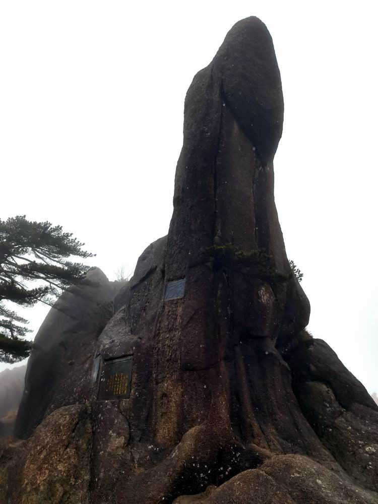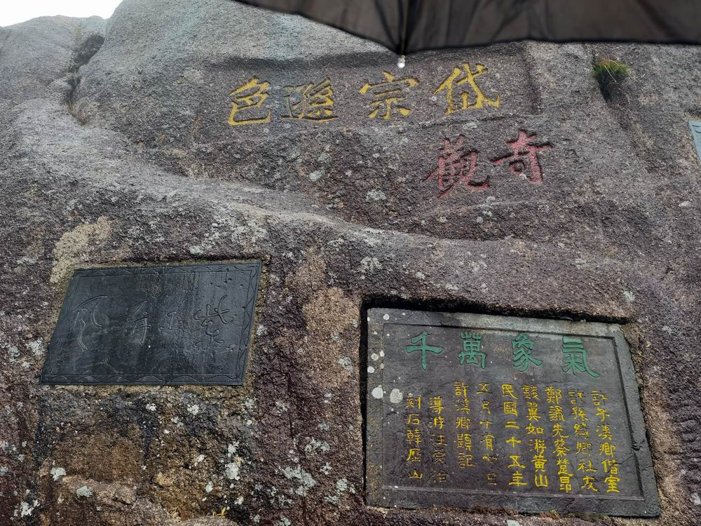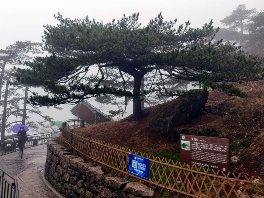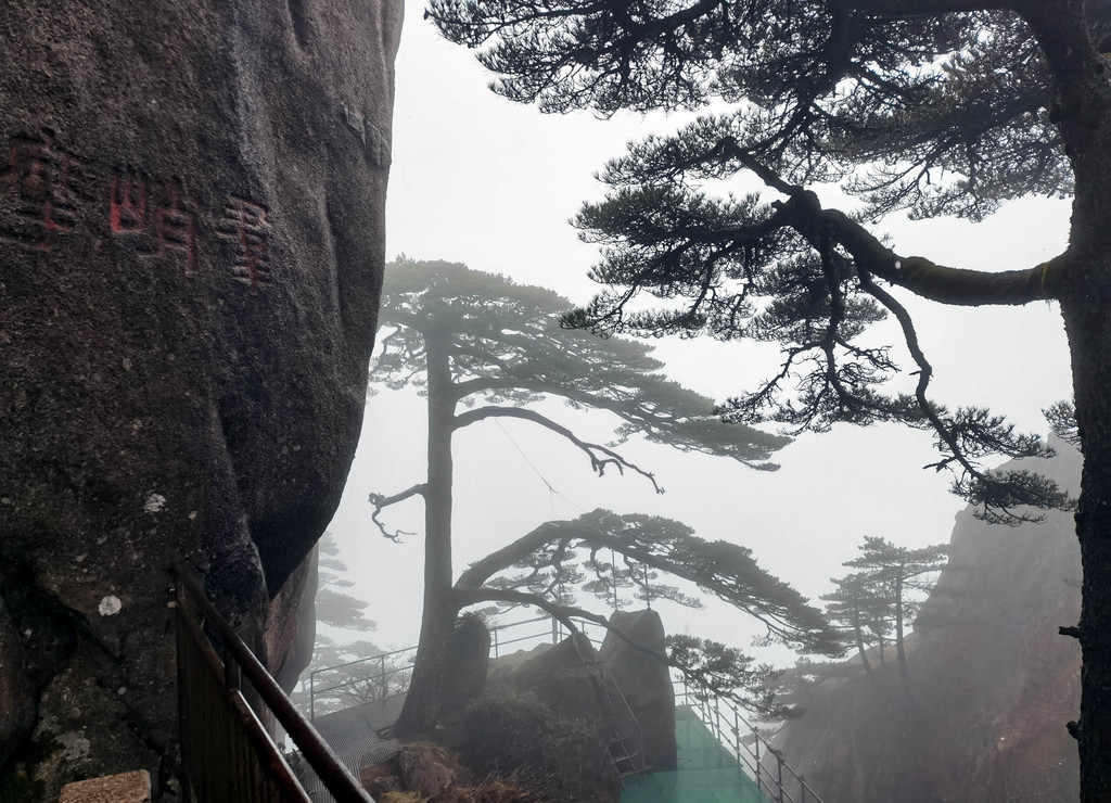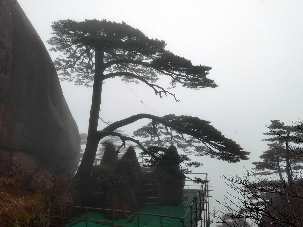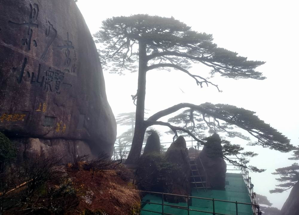 迎客松树龄至少已有800年,是黄山"四绝"之一。雨雾的原因,迎客松旁边山崖上的石刻,看不太清楚了。