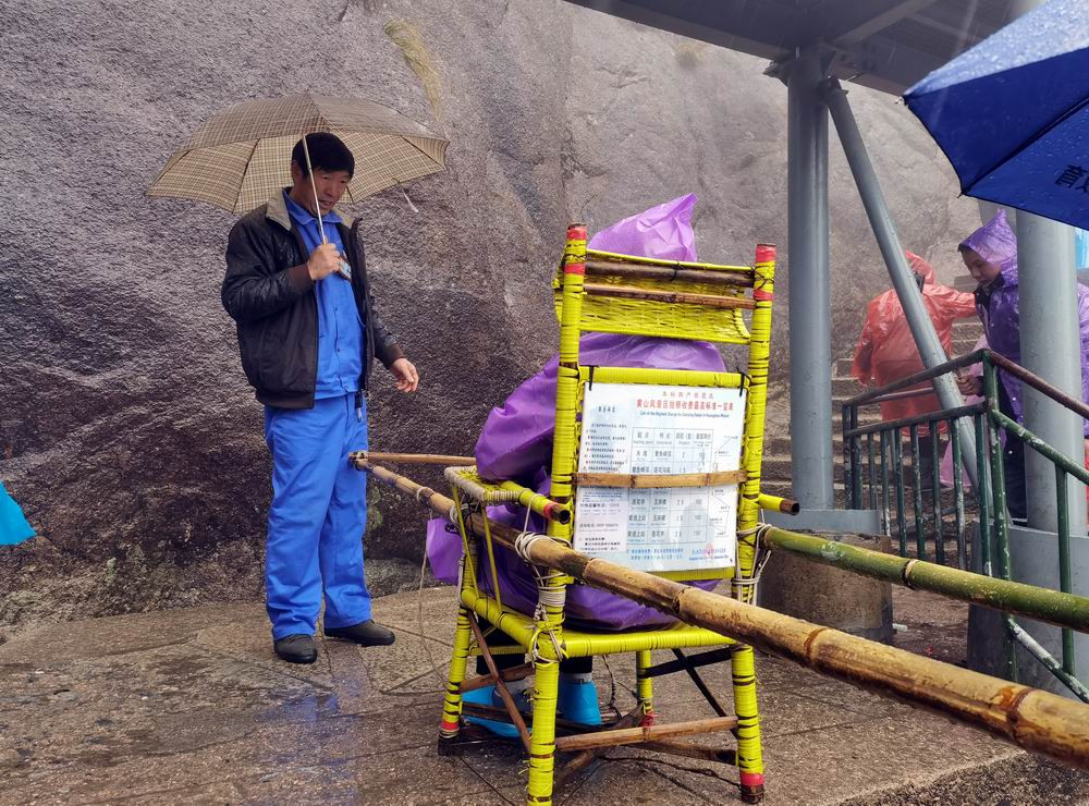 雨中爬山更累,有些老人不得不坐滑竿。