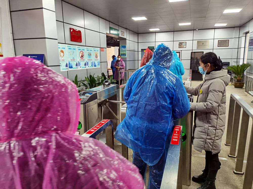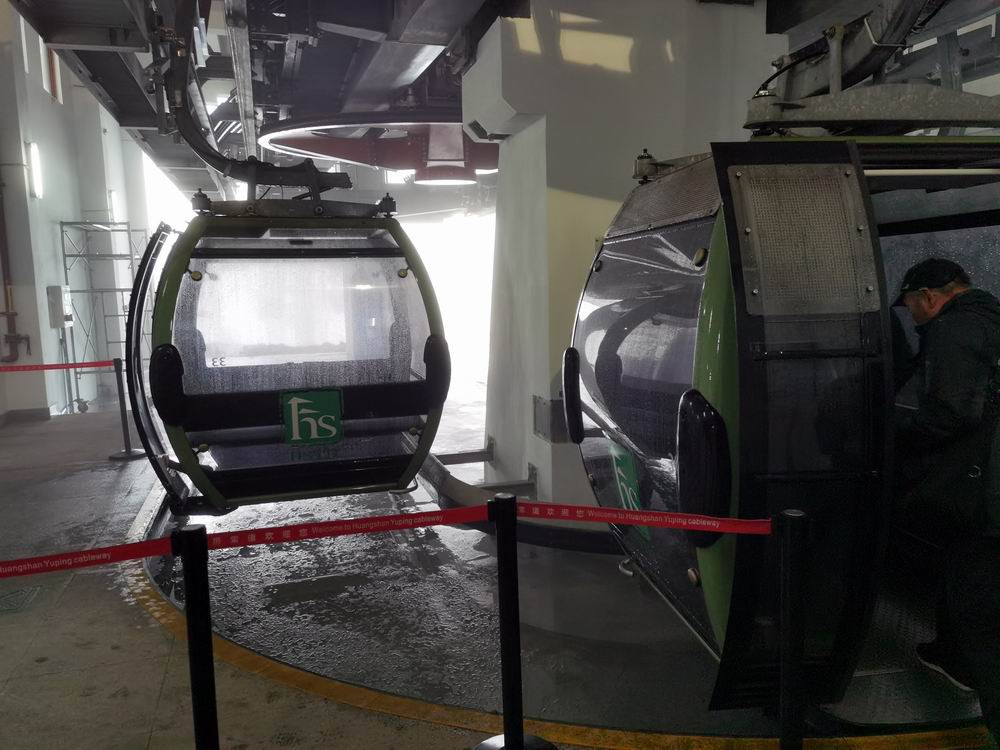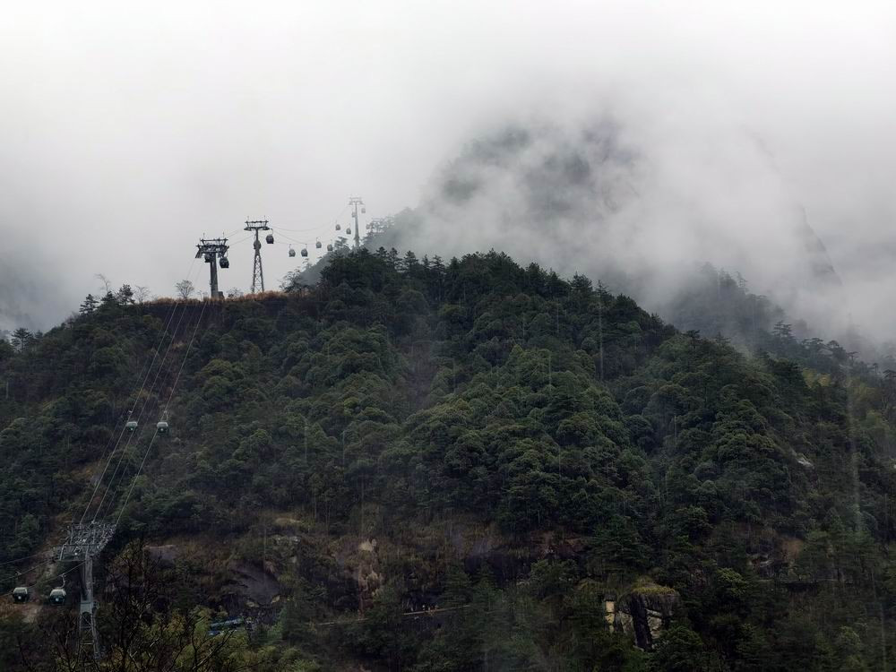 从前山登山步行要上行15华里,经过了3个小时的艰苦跋涉才能到达精华景区,乘坐索道只需8分钟到达玉屏楼索道站。游客全都穿着雨衣走出索道站。