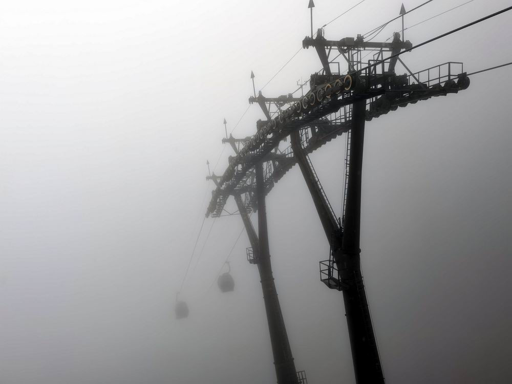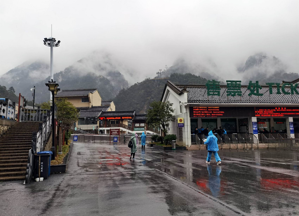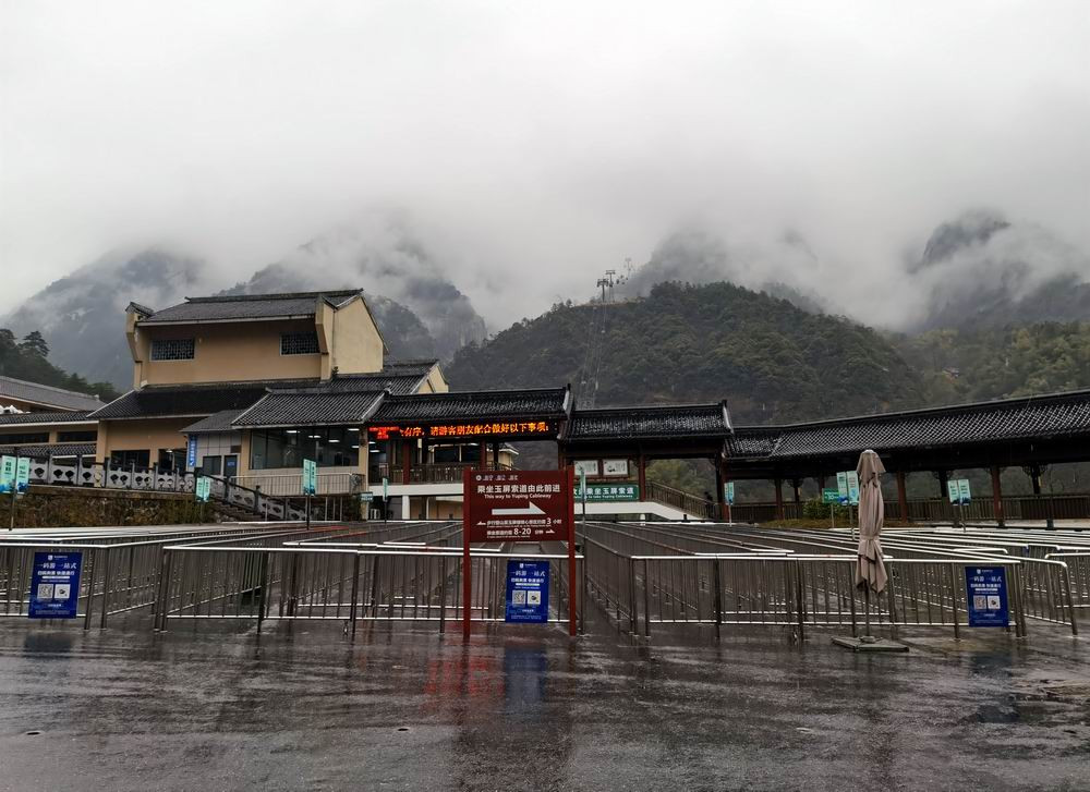 玉屏索道售票处,笼罩在阴雨中。