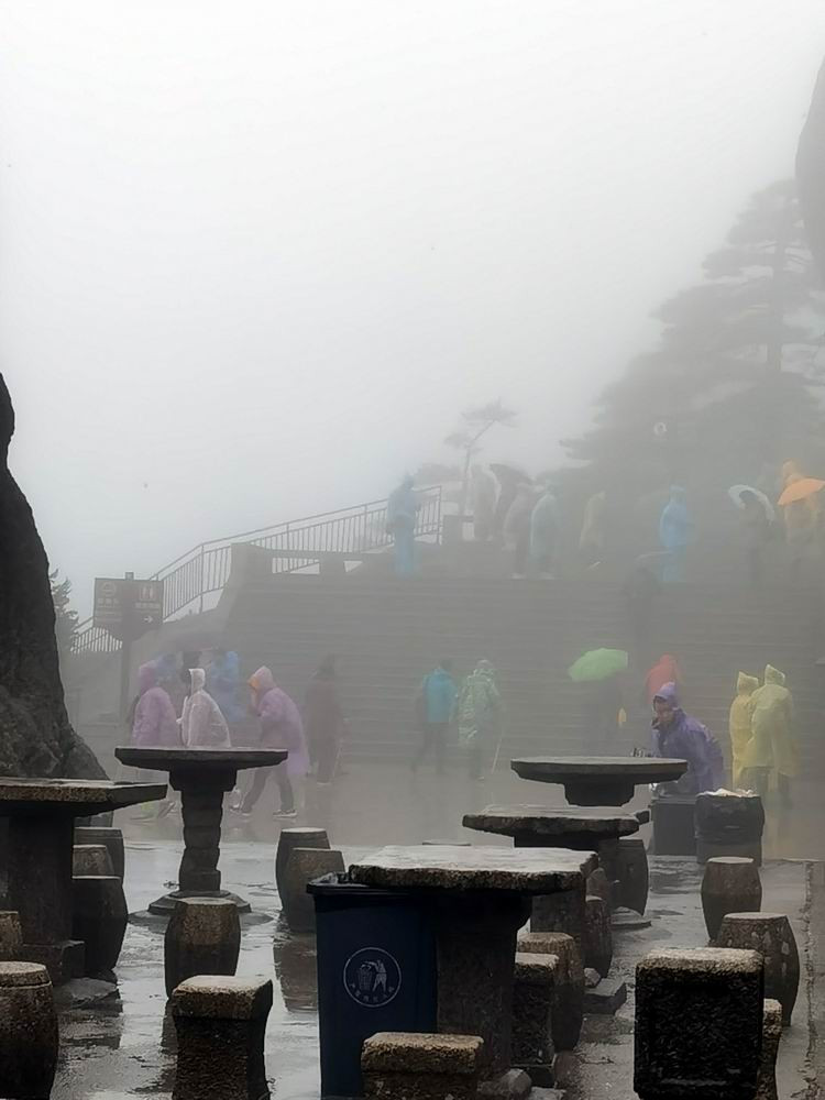 黄山的天气可谓是变化莫测,晴天,雨天,雾天转瞬即逝。一年365天在山上180天都是阴雨天。黄山的奇松、怪石、云海、温泉四大美景与天气紧紧相连。但今天的雨和雾太大,能见度不到50米。