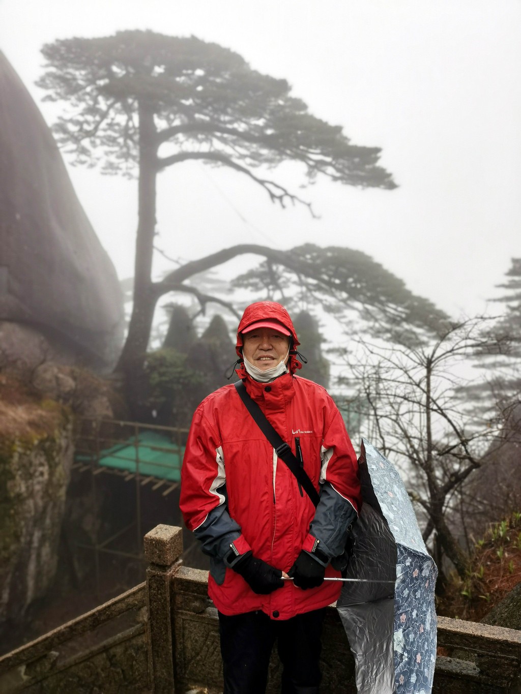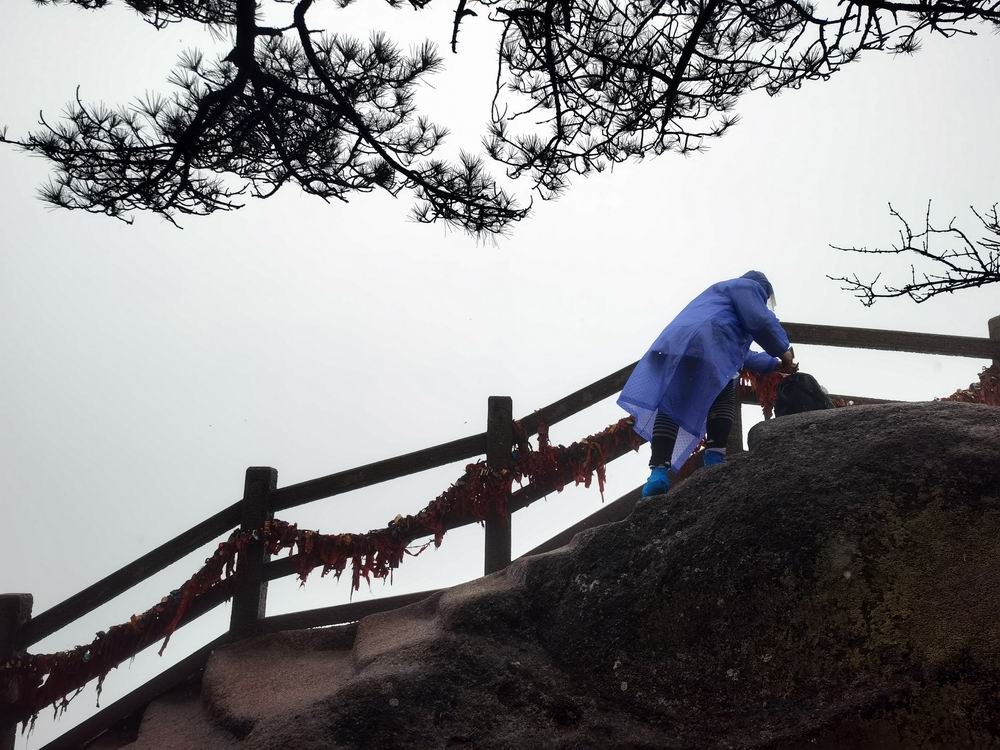 即便是雨中,也要在迎客松前留一张纪念照。