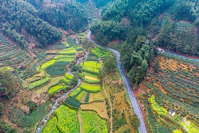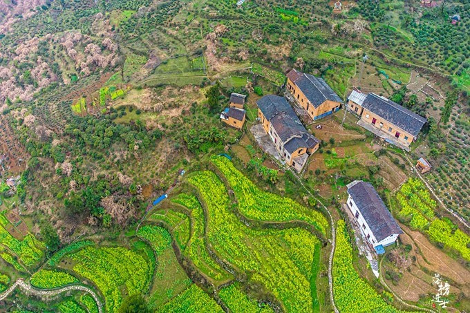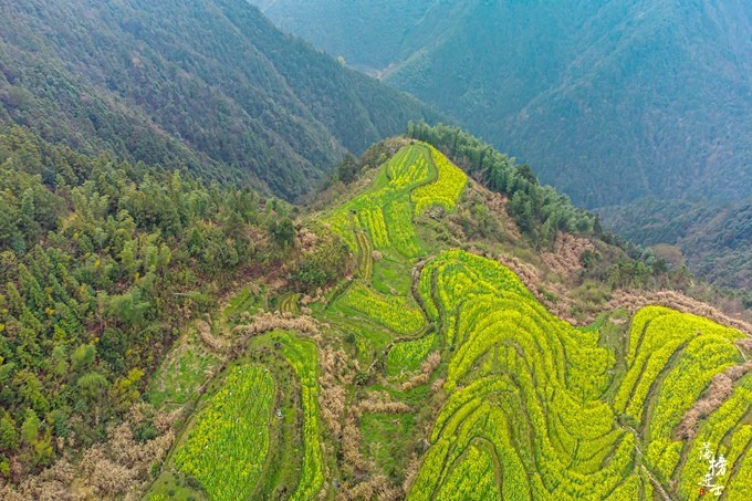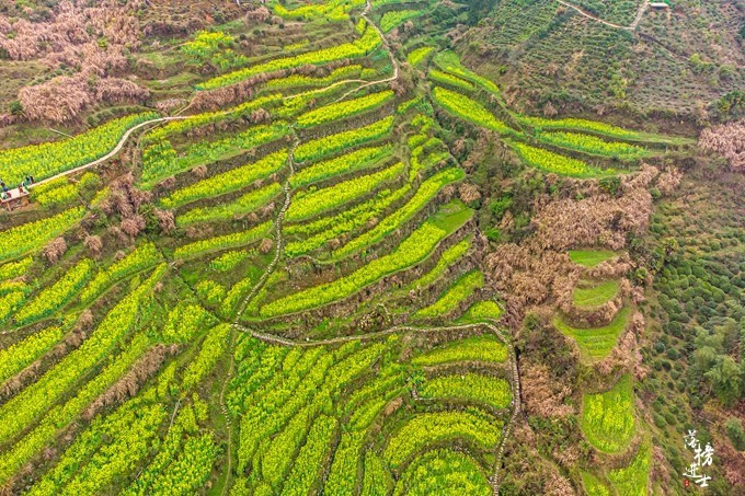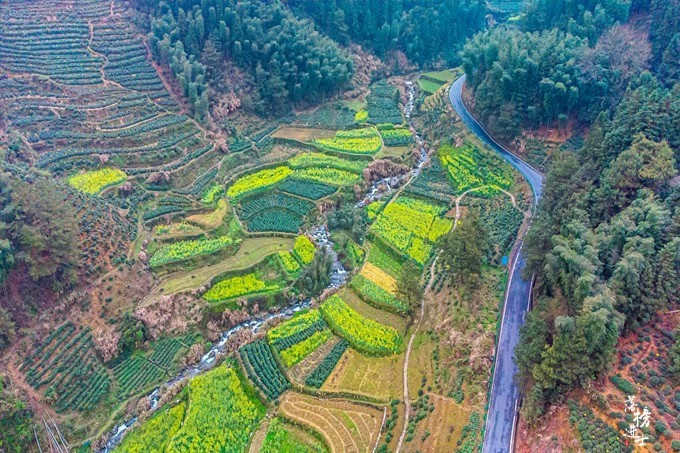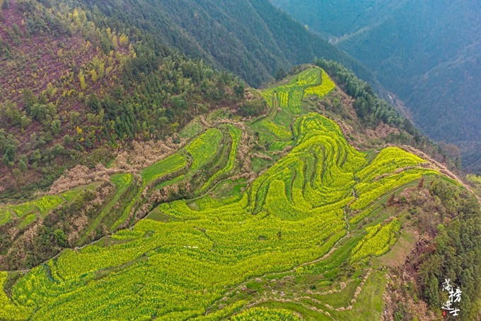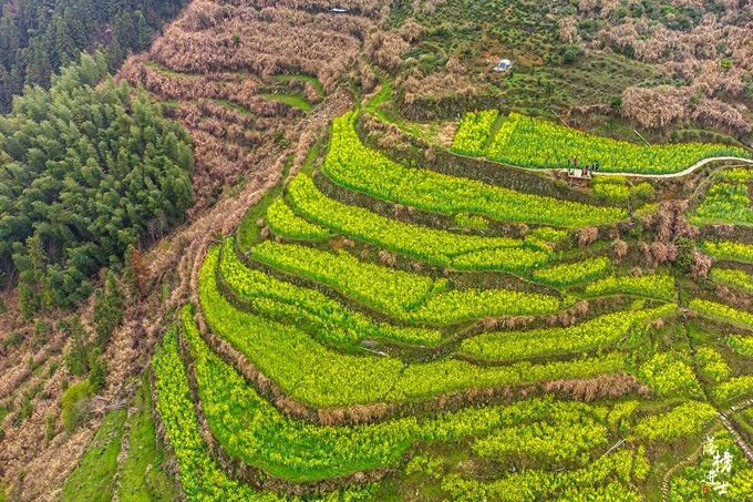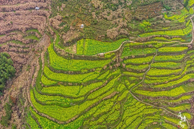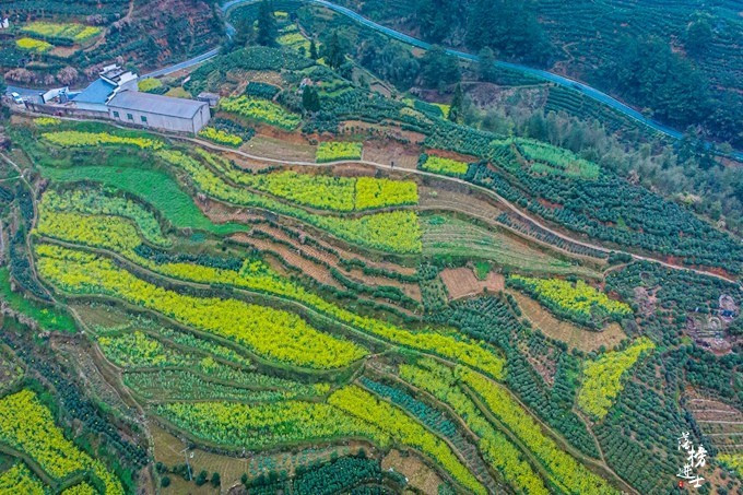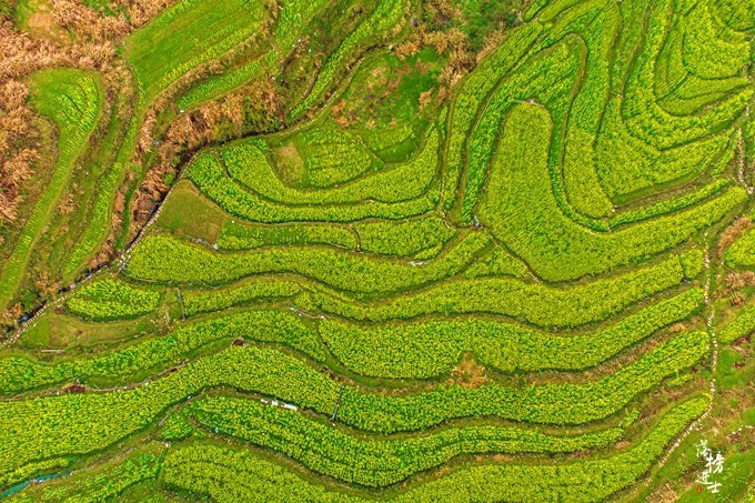 梯田阡陌纵横、错落有致,绿油油的田里早熟的油菜花悄然盛开,生机盎然,从高空俯瞰,美丽中更多加了几分壮观。