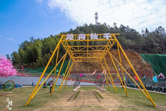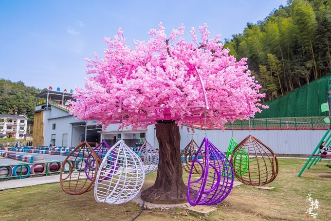 景区内各种游乐设施齐全,高空玻璃滑道、山泉流水、高空蹦极是勇敢者的游戏,人工装饰出的桃花树让人不禁想起曾经大热的电视剧《三生三世十里桃花》,坐在树下的摇椅中,随便一拍都很有意境。