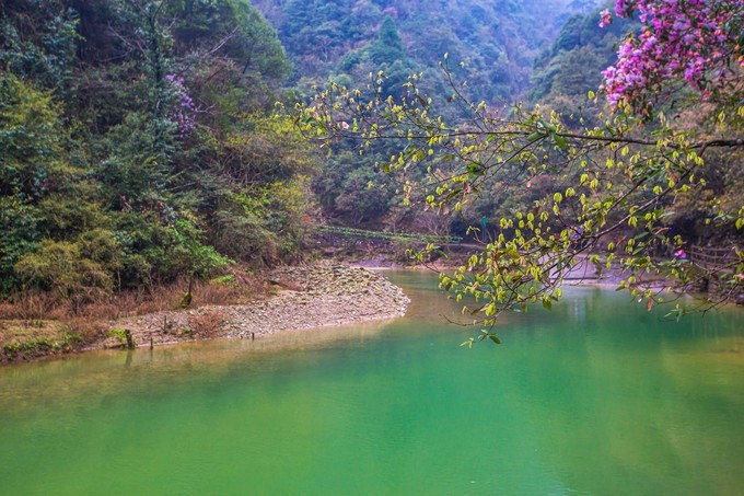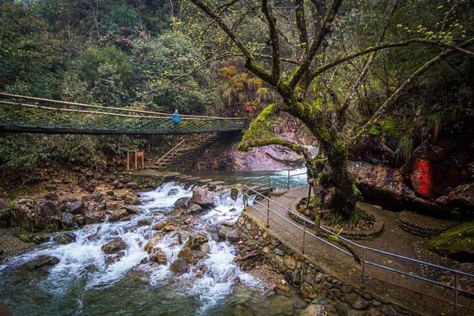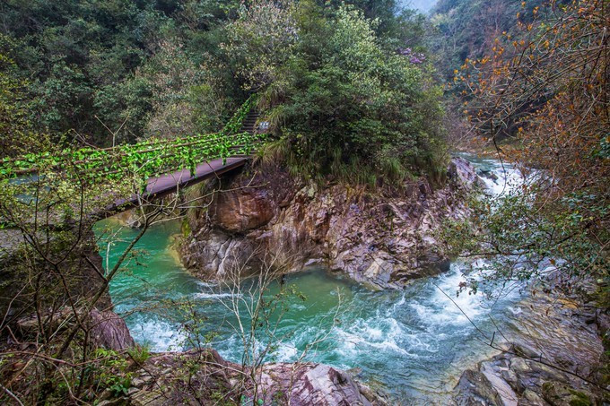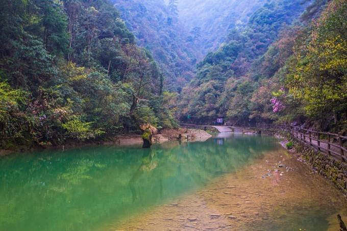 湖水纯净的色彩让人心醉不已,在沿途木桥、索桥、栈道的牵引下,人们溯源而上,一路伴着水声,也伴着不绝于耳的鸟鸣。
