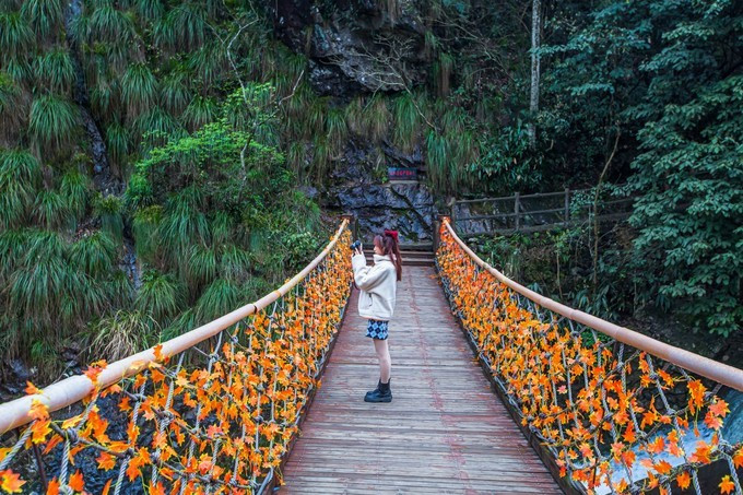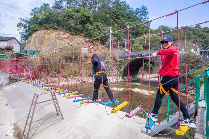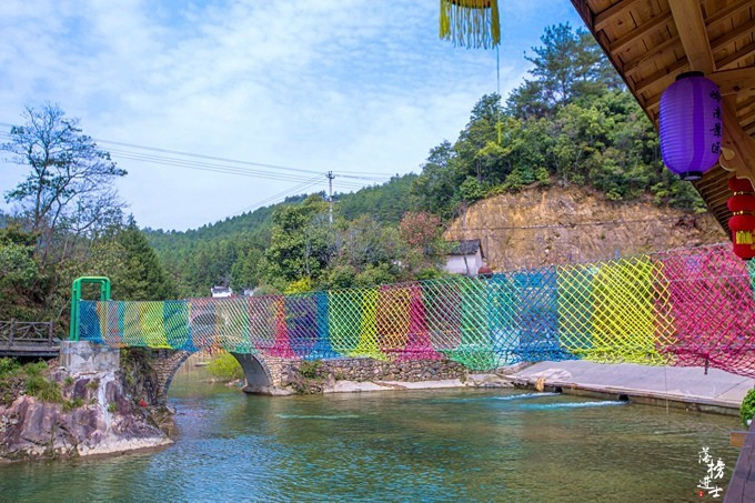 架在溪流的桥梁以七彩颜色装饰,仿佛一道彩虹横跨水上。人行其上,左右摇摇荡荡,虽然明明知道不会掉到 水里 ,依然会生出小心翼翼、胆战心惊的感觉。