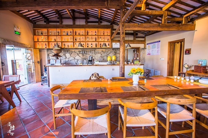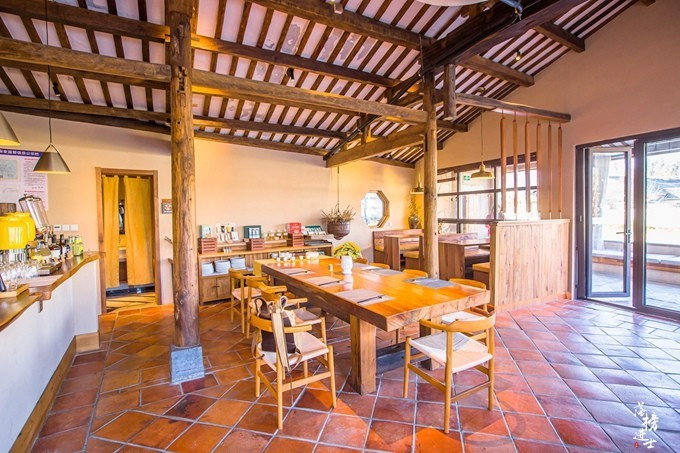 餐厅宽敞明亮,木桌木椅木门,房屋顶上也是密密可见的房梁,质朴而自然,清新却有生出温度,让人有种亲切和安心感。