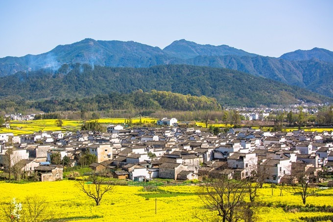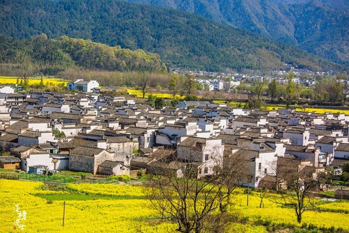 位于 安徽 省 黟县 的卢村,此时正被无边无际的油菜花萦绕着,从村外的观景台眺望整座村落,粉墙黛瓦的民居闪亮着独有的光芒 和美 丽。