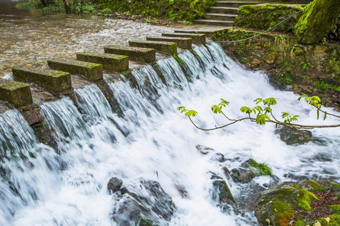成片的梯田错落有致,从娇嫩的黄过度到清新的绿,似乎能在其中看见春天不紧不慢的脚步。一条小溪在山间流过,时上时下、时缓时急,水面泛起白色浪花,一路前行着串联起一山的好景色。