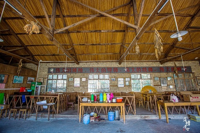 公社里还留着独属于那个年代的标语,无论桌椅甚至暖瓶水壶搪瓷盆,都是年代久远的老物件。