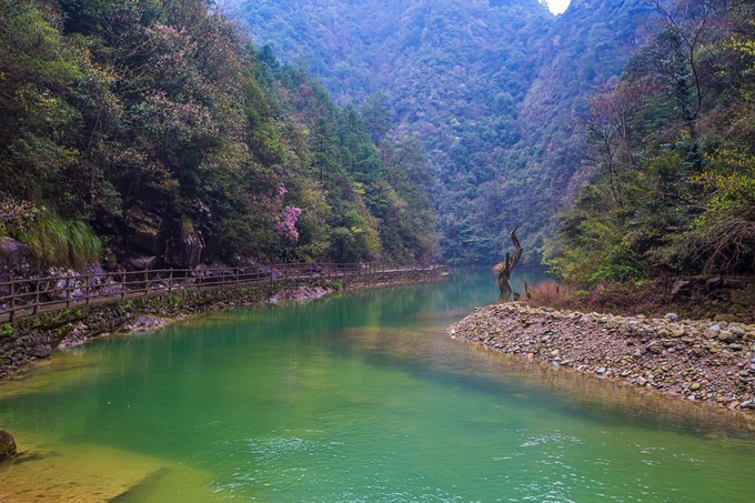 在大峡谷内沿着水流步行是一种无与伦比的美妙享受。阳光打在水面上,波光粼粼,青山对向而立,让人不由想起“两岸猿声啼不住,轻舟已过万重山”的诗句。