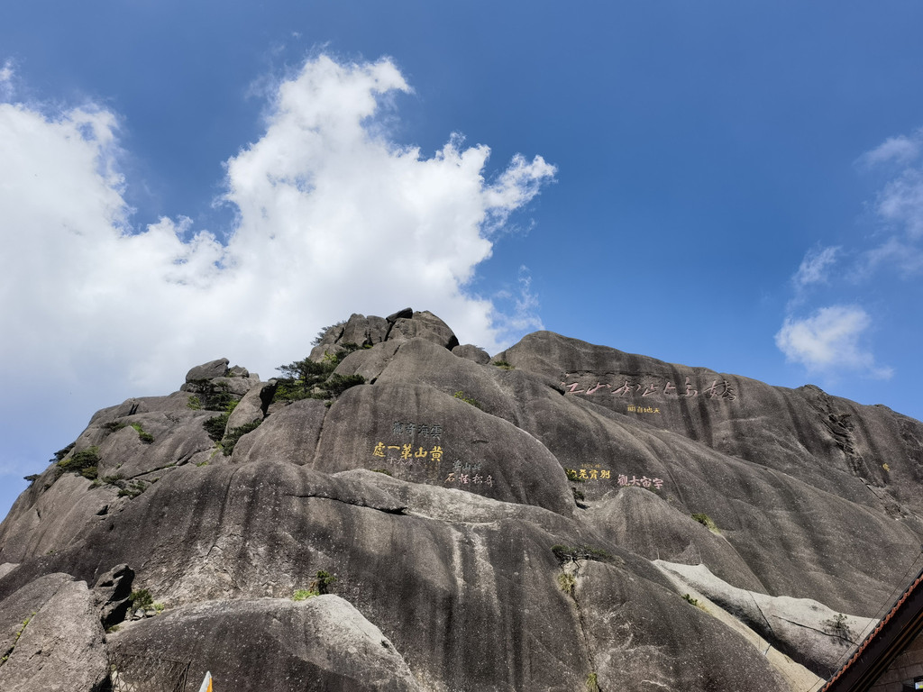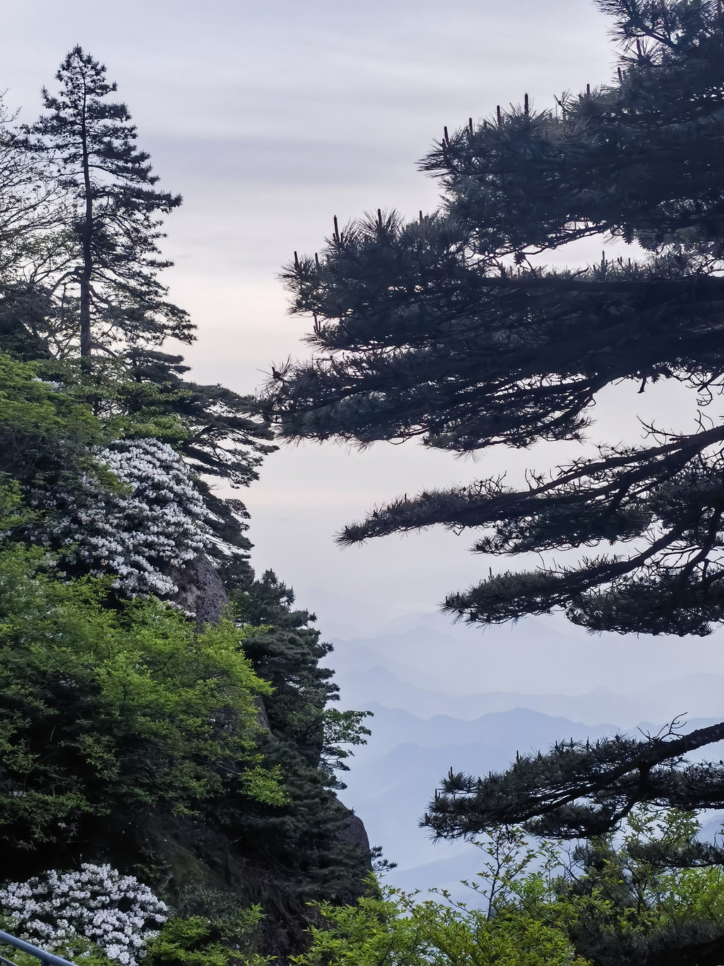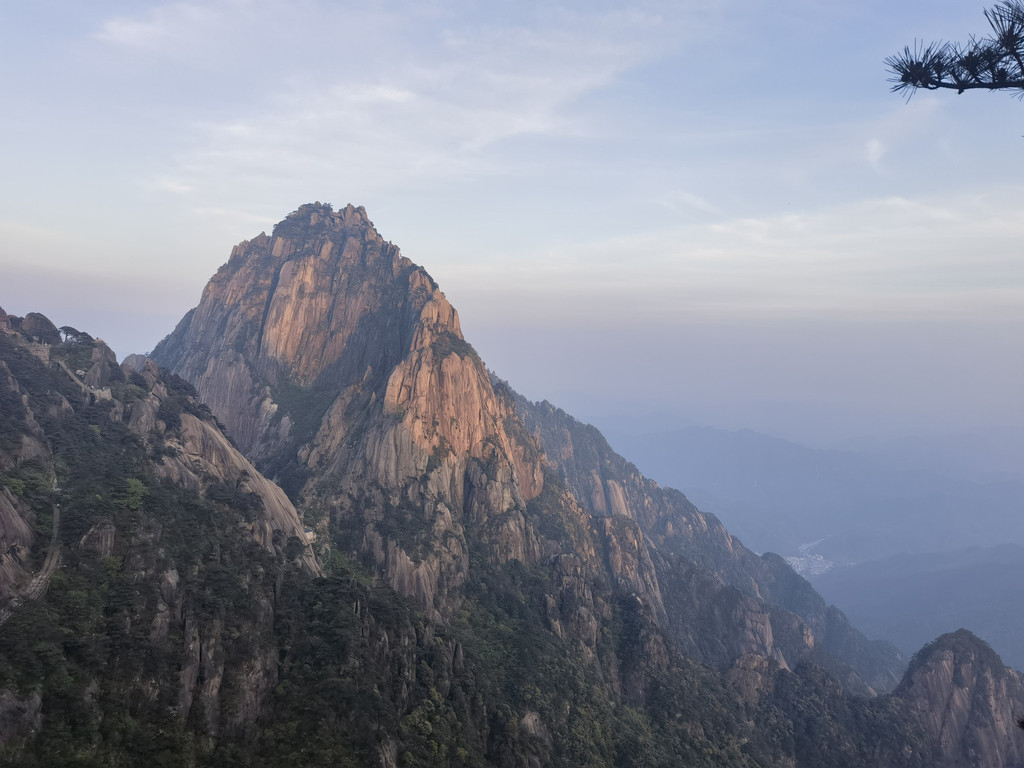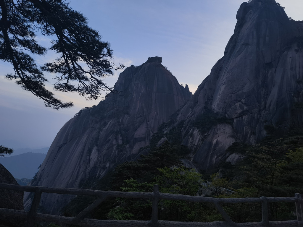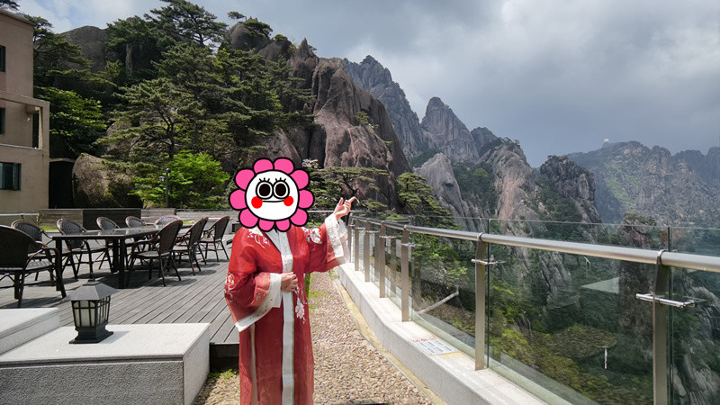 出行。不用的行李我们都存到了温德姆,很方便。酒店免费提供登山杖,非常赞!大约8点钟出发,10分钟便走到了黄山风景名胜游客中心。我们分两个方向排索道,据当地人说五一小长假刚刚过去,人少了不少呢,要不是免费日,人会更少。但在我们看来人还是蛮多的。太姥姥和姥姥坐索道直奔玉屏宾馆,有一段是需要爬楼梯的,走走停停大约用了2个小时,正常不到1小时就能走到的。到了玉屏楼宾馆,服务员说免费提供汉服,样式也还不错;姥姥就拿了几件给太姥姥穿上,去露台给他老人家拍照,很仙儿的感觉。宾馆标注了看日出日落的预计时间,服务员告诉我们15分钟走到看日落的地方。看日出的地方很近5、6分钟。我们住在那里就是为了看日出和日落。