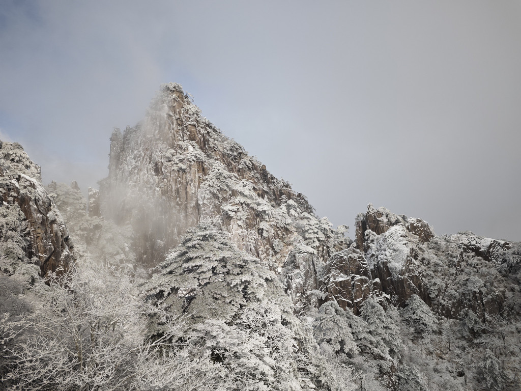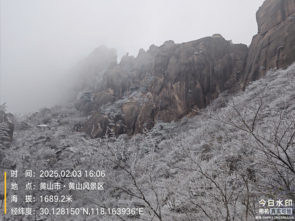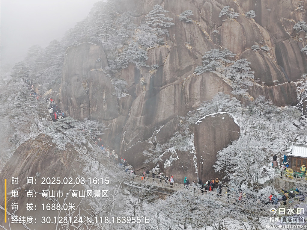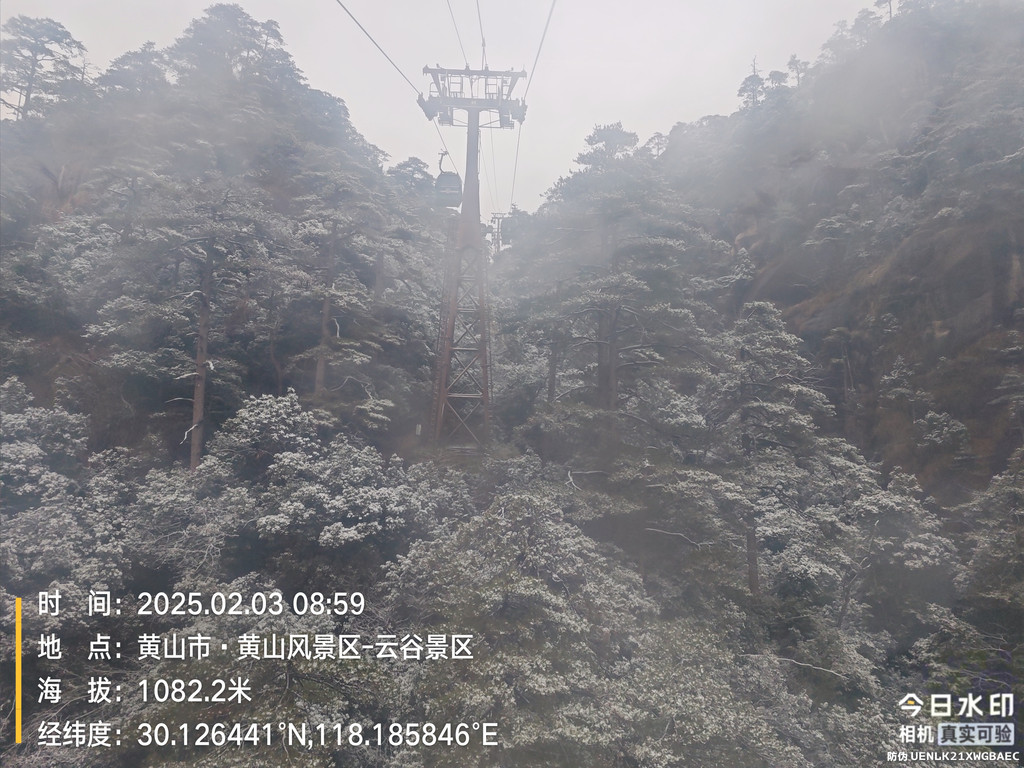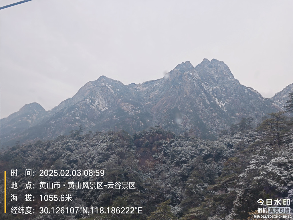我们坐索道从云谷寺到白鹅岭上山,晚上坐索道从玉屏楼到慈光阁下山。游览路线为云谷寺—白鹅岭—黑虎松—竖琴松—始信峰—北海—清凉台—猴子观海—狮子峰—西海—排云楼—光明顶—白云宾馆—鳌鱼峰—一线天—百步云梯—迎客松—半山寺—慈光阁。由于下雪,鳌鱼峰、天都峰暂未开放。