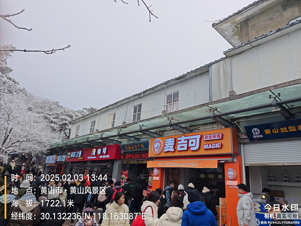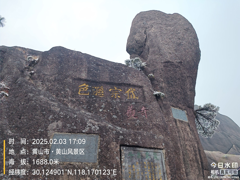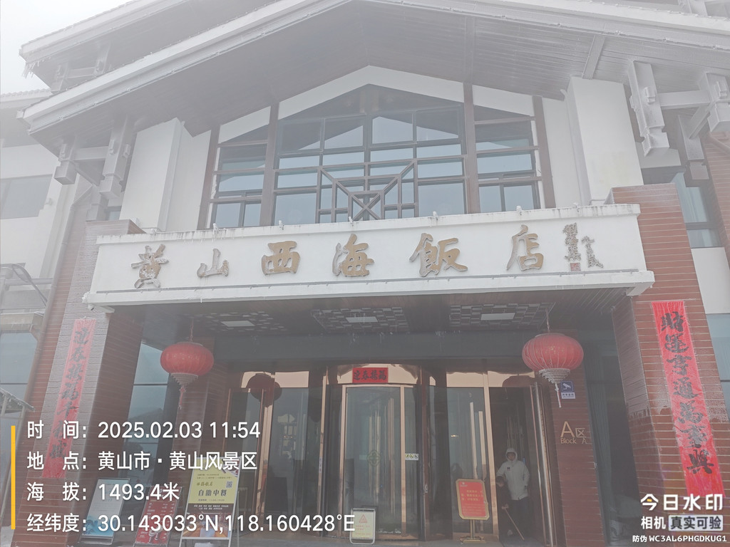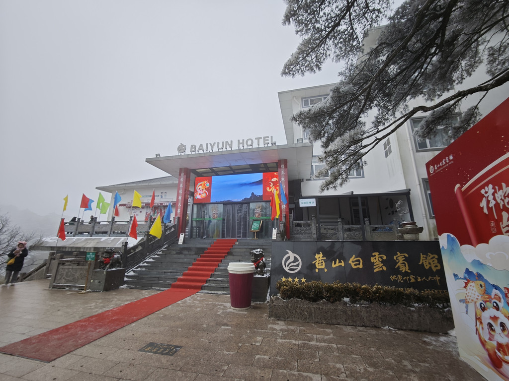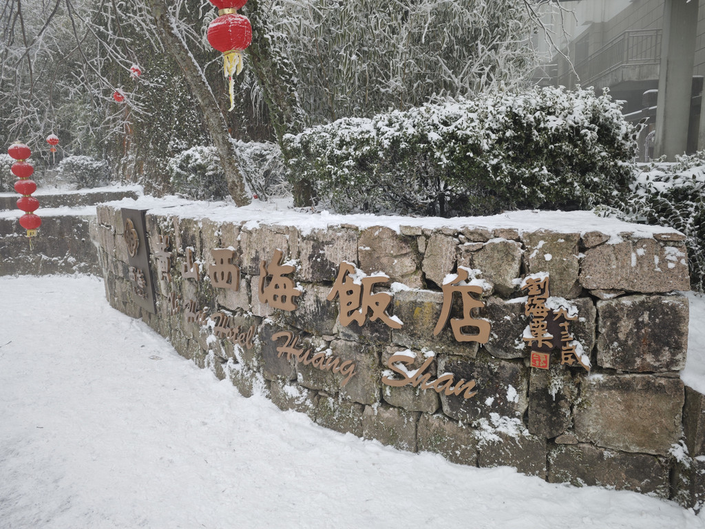 景区有南门、西门和北门,绝大多数游客都会从南门出入。我们选择在汤口镇的黄山景区南门登山。我们到达汤口镇时,天空下起了小雨。宾馆的老板告诉我们山顶下雪了,山路不好走,要带登山杖和冰爪。我们从家里出发时也准备了冬季登山的用具。