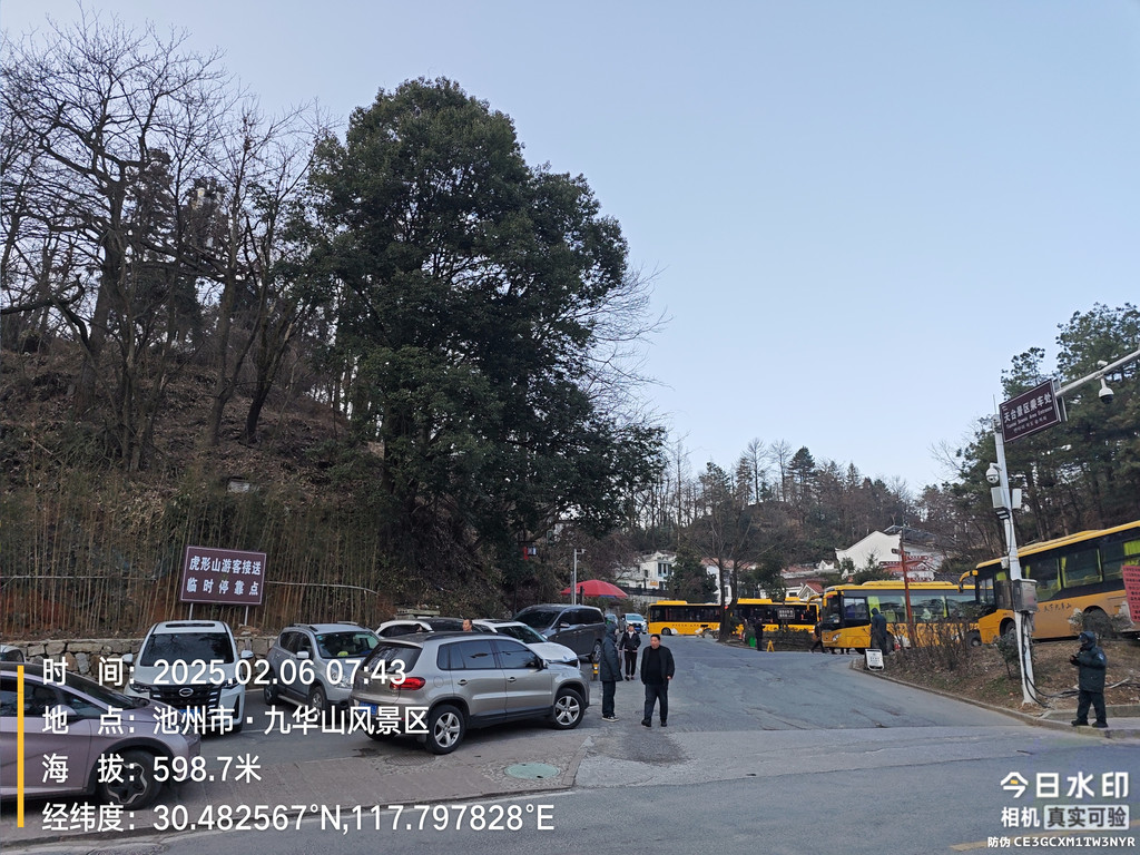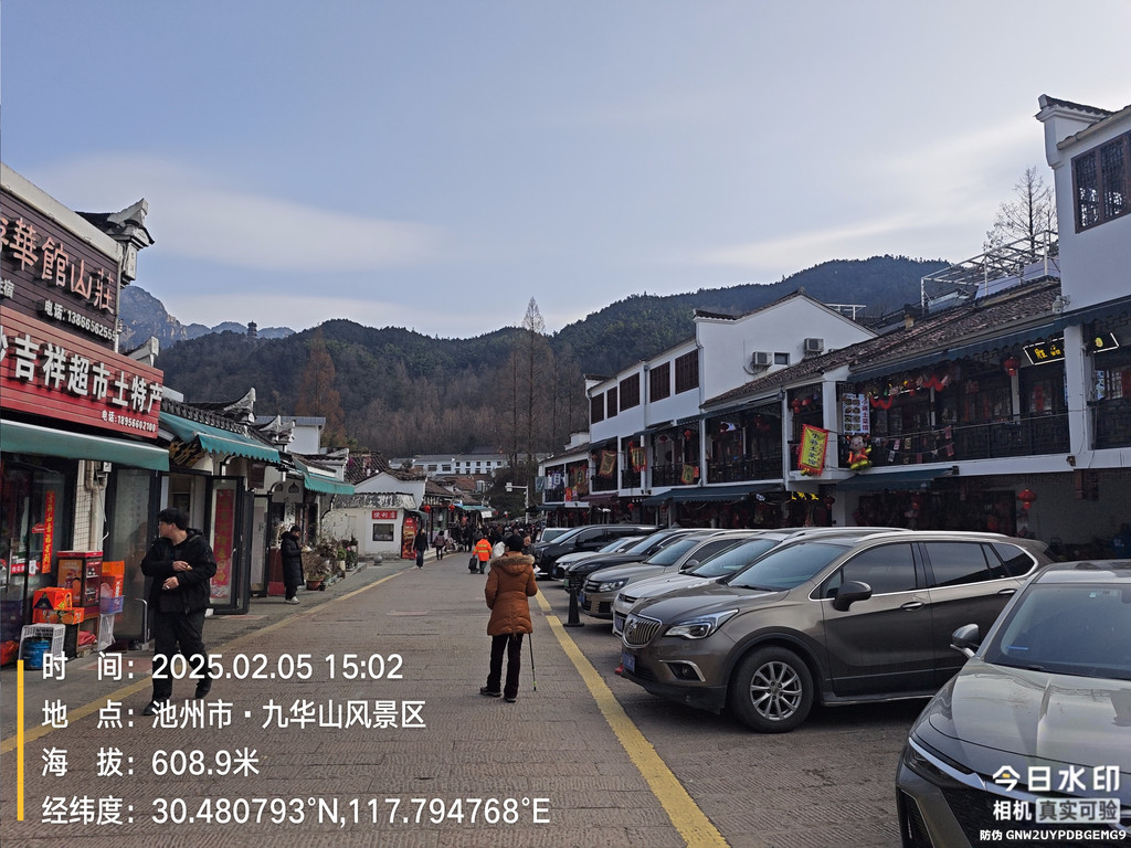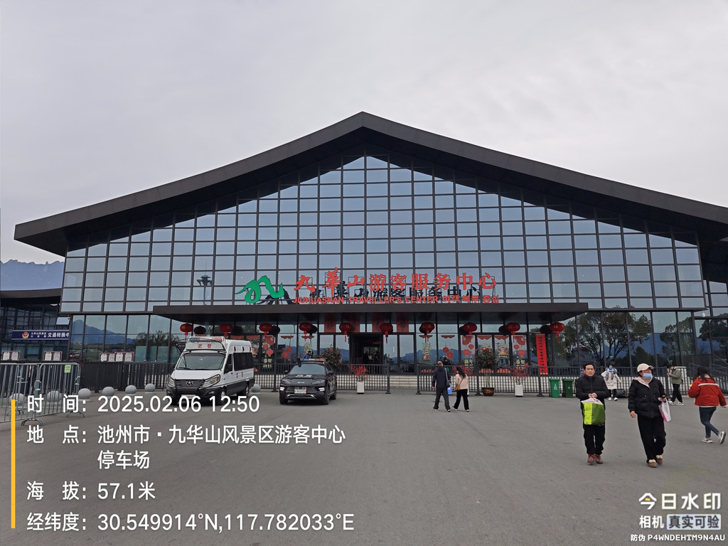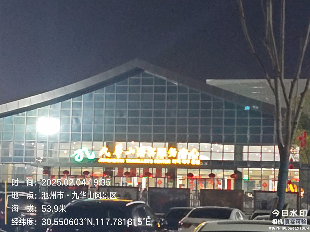从徽州古城走高速去九华山景区,春节假期进入尾声,这段路车不多,晚上19点半到达九华山景区游客中心停车场。春节期间自驾车不能开上山,我们把车停在游客中心停车场,坐景区大巴到山上,联系了民宿老板开车在山上景区大巴停车场接我们。