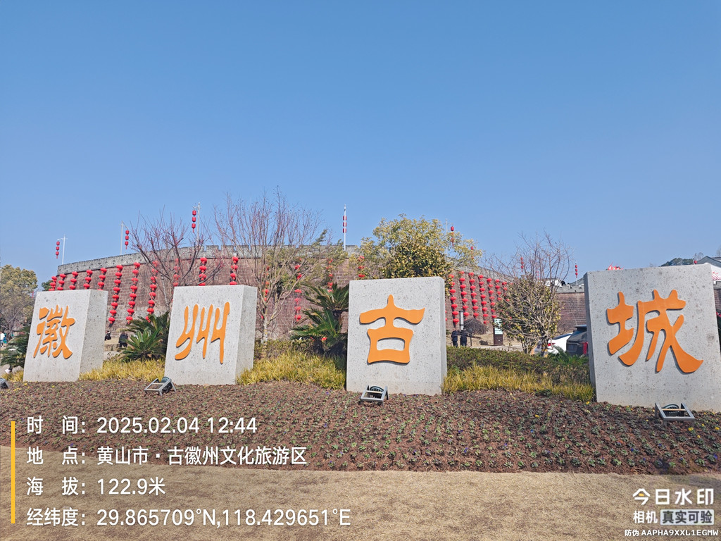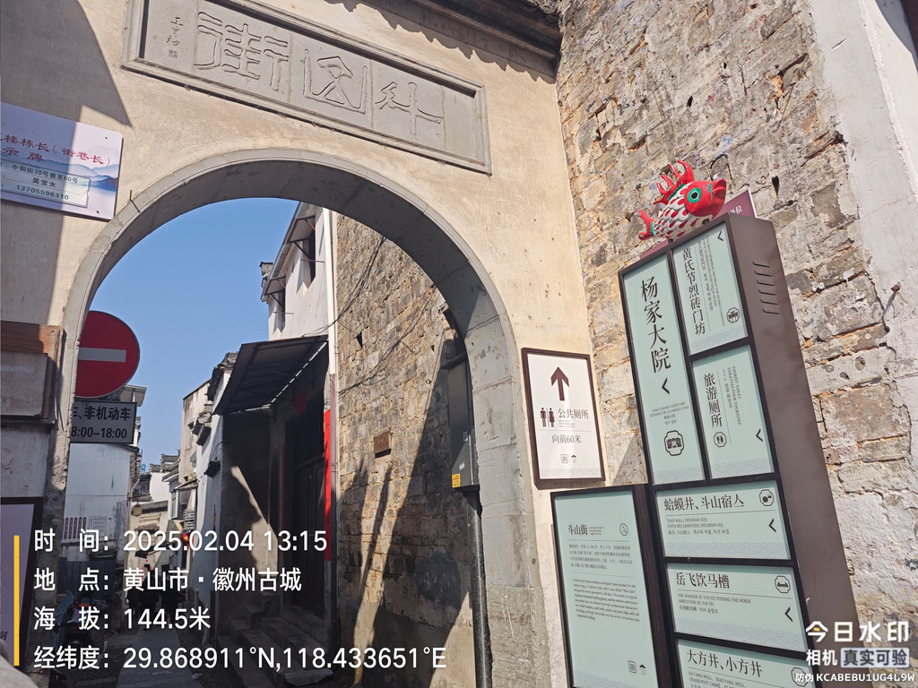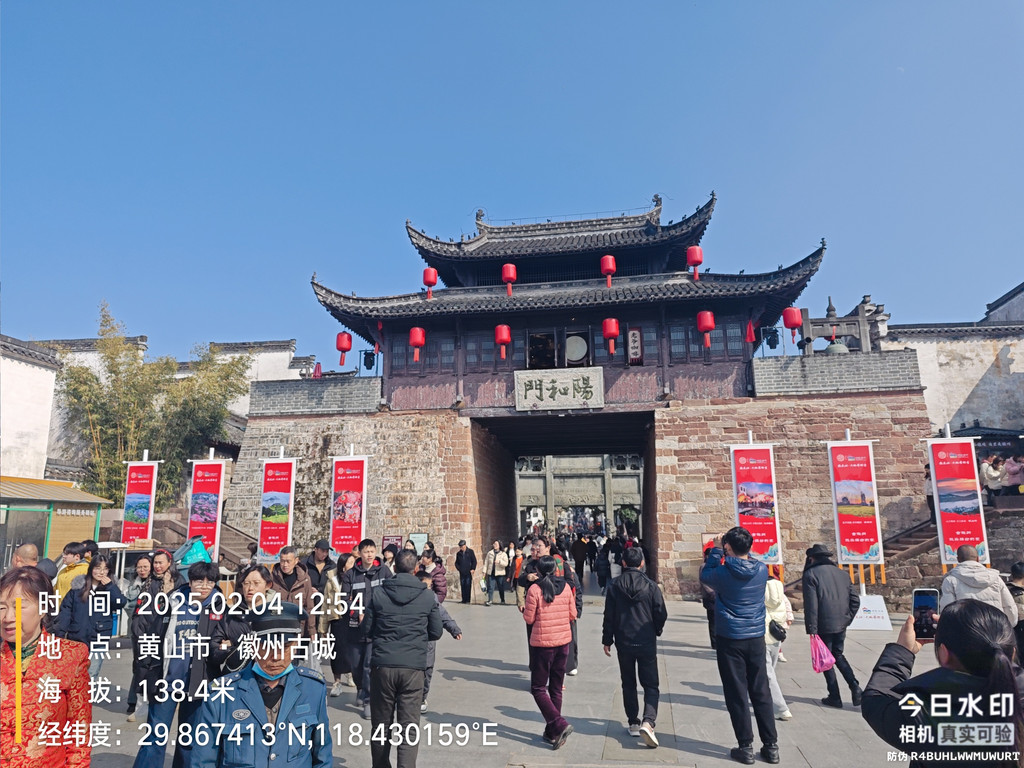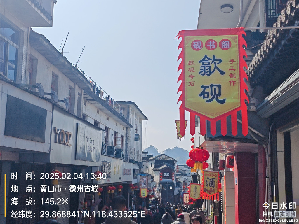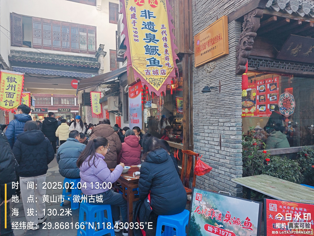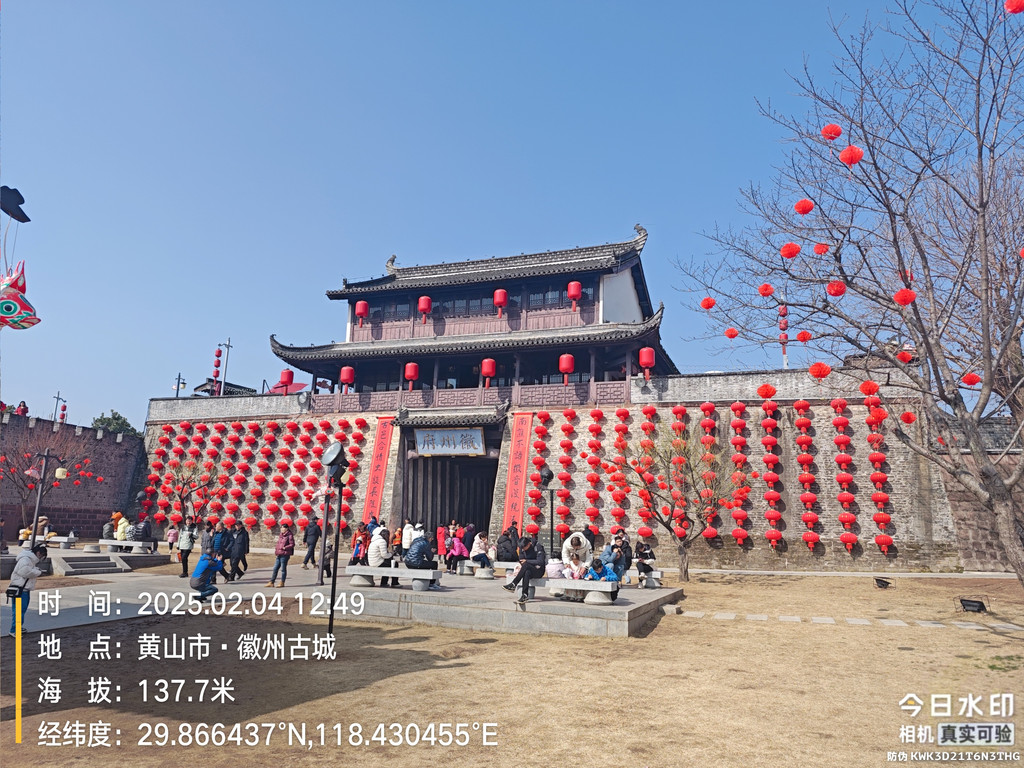 从汤口镇上高速去往徽州古城,春节期间路上车较多,缓行路段较长,还遇到一起事故,耽误一点时间。中午到达徽州古城时,停车场已经停满车,路边停车位都停满车,古城周围停车不方便,开出很远才停好车。