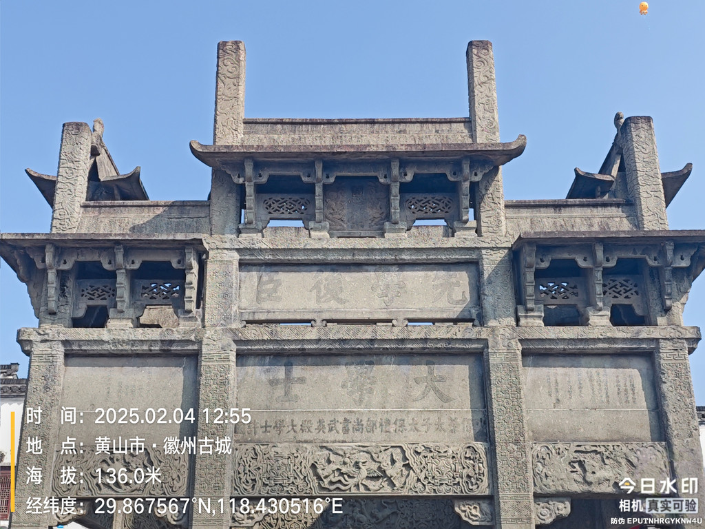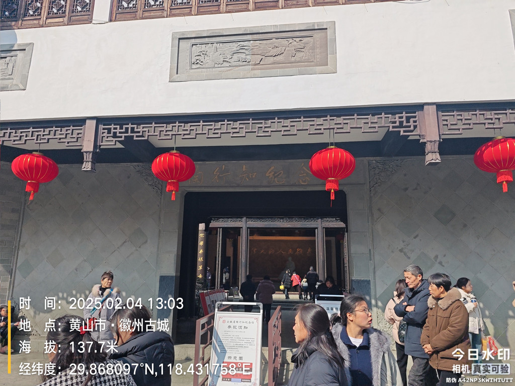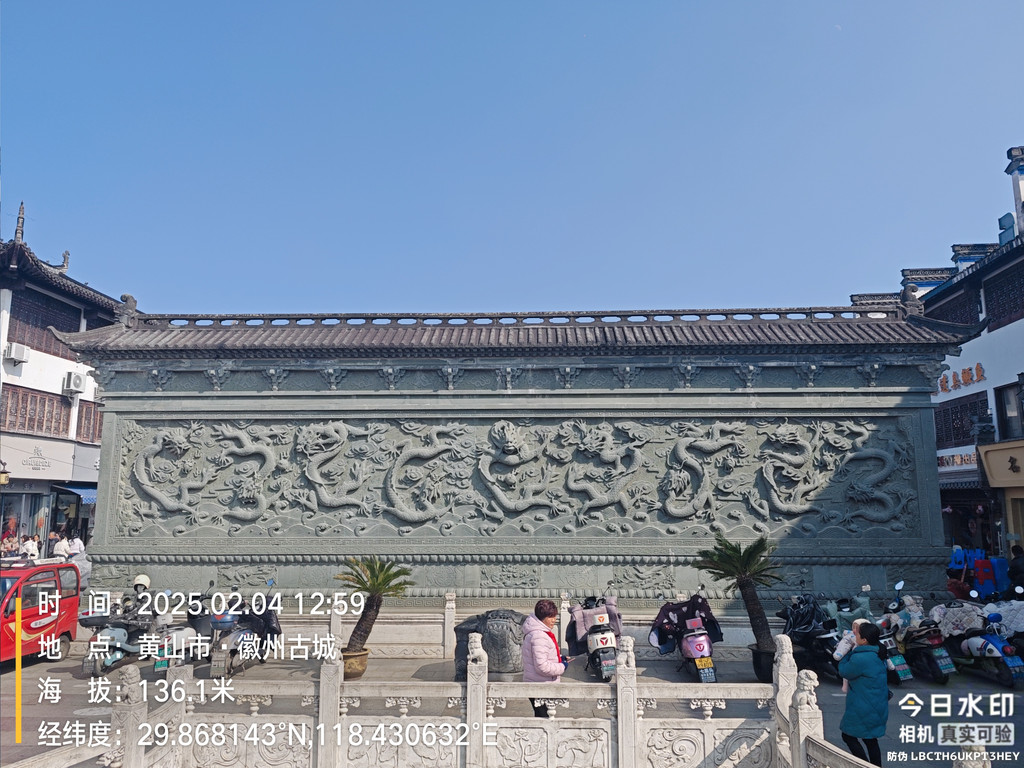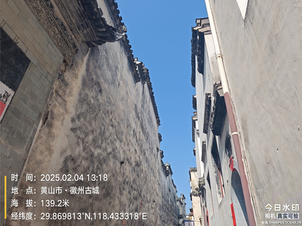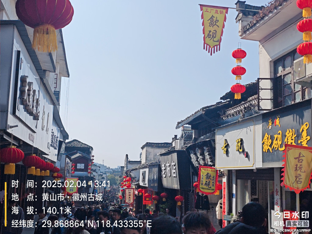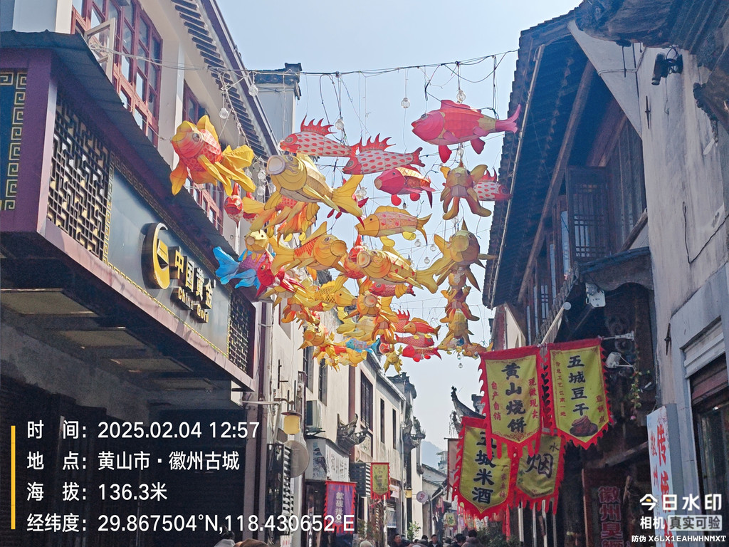 从汤口镇上高速去往徽州古城,春节期间路上车较多,缓行路段较长,还遇到一起事故,耽误一点时间。中午到达徽州古城时,停车场已经停满车,路边停车位都停满车,古城周围停车不方便,开出很远才停好车。