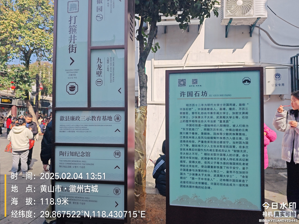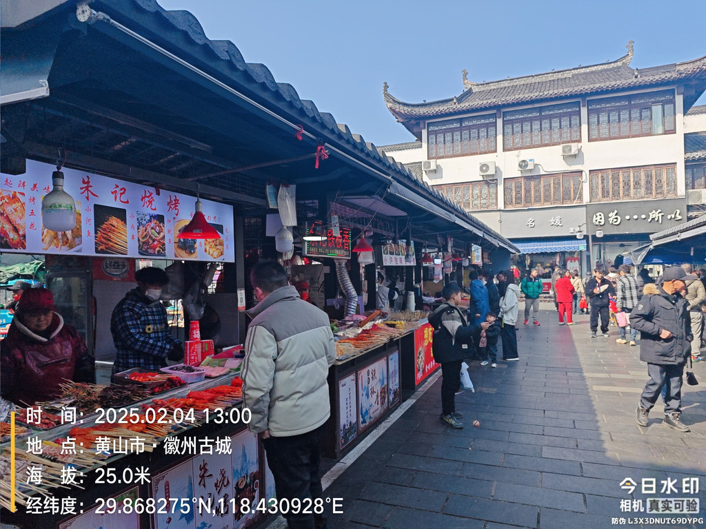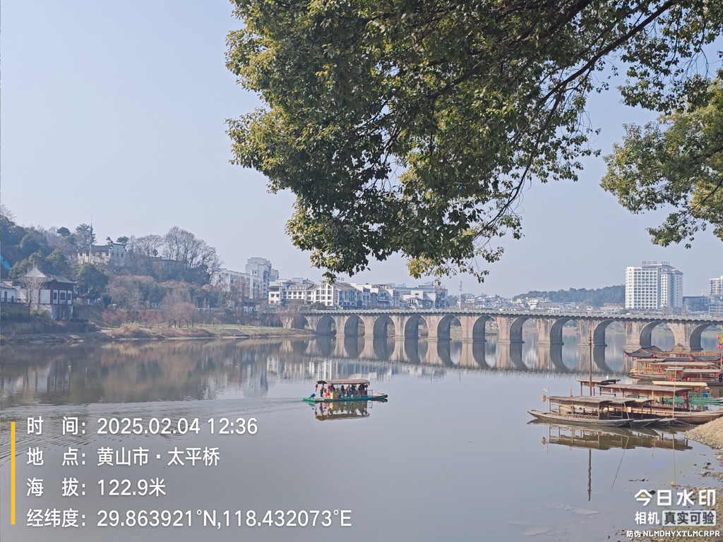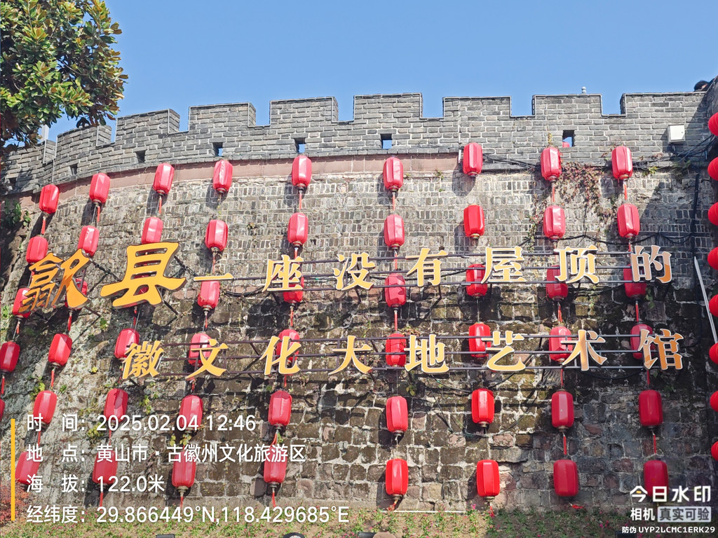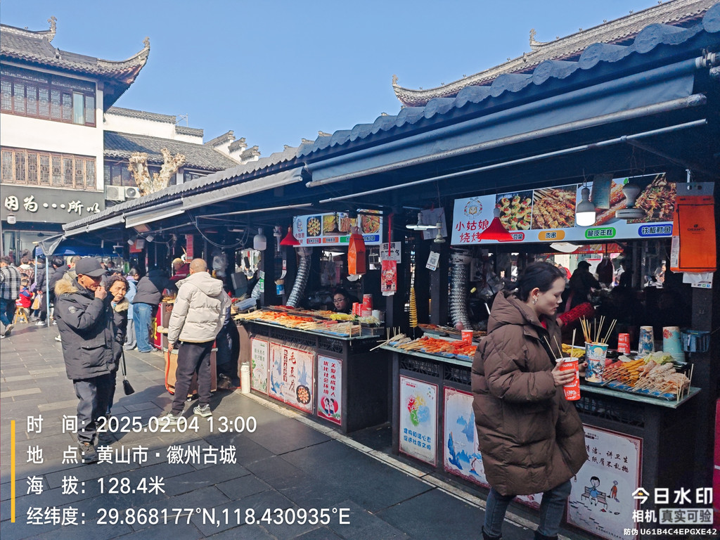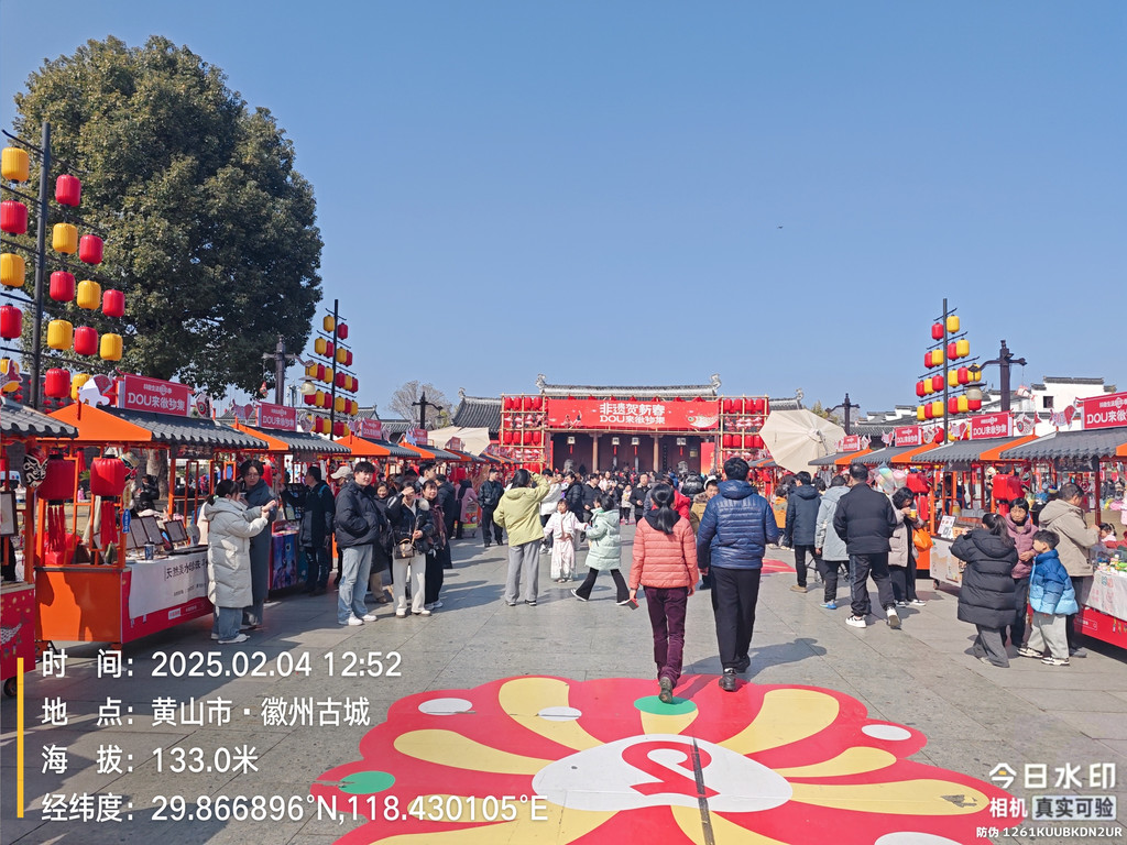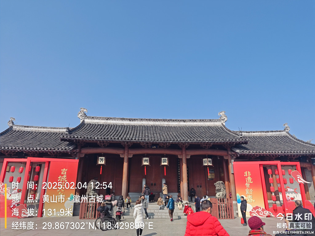从汤口镇上高速去往徽州古城,春节期间路上车较多,缓行路段较长,还遇到一起事故,耽误一点时间。中午到达徽州古城时,停车场已经停满车,路边停车位都停满车,古城周围停车不方便,开出很远才停好车。