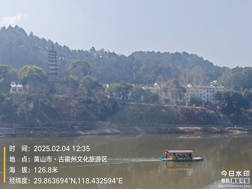 徽州古城外面练江上的游船,对面是太平兴国寺和长庆寺塔。
