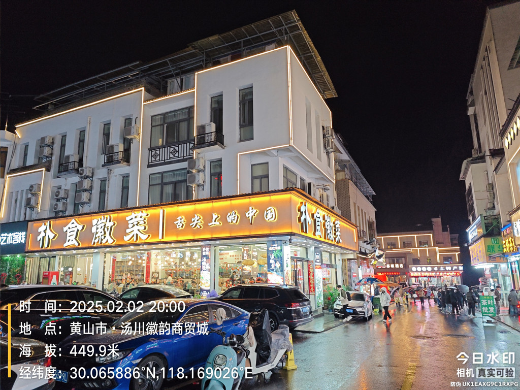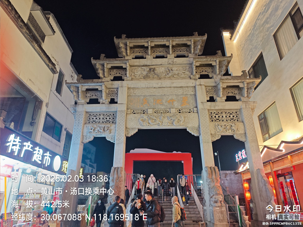 汤口镇的夜景,左边是黄山景区南门换乘中心。汤口镇非常繁华,宾馆、饭店、超市,吃、穿、用一应俱全。