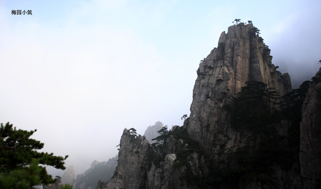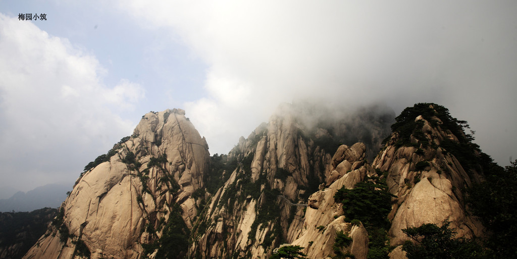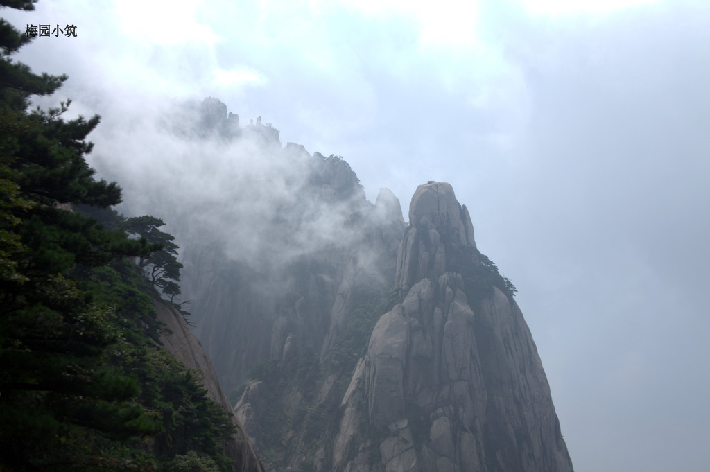 周 围因为他们而静了下来,原来,宁静是无处不在的,关键是人的心。这时,再看那云雾笼罩的天都峰,感觉竟然是别样的不同,雾来时,风起浪涌;雾去时,飘飘悠 悠。雾浓时,像帷幕遮住了万般秀色;雾稀时,像轻纱给山川披上了一层飘逸的外衣。就好象是一幅中国的水墨山水画,而且,是那种泼墨山水画,尽去了山水画中 的浮华之气,仅用水墨渲淡而成,韵味含蓄而丰富,意境清旷苍秀,怎么看,都有神奇中的变化!怎么看,都是变化中的神奇!!
