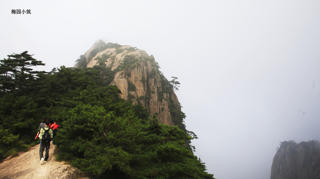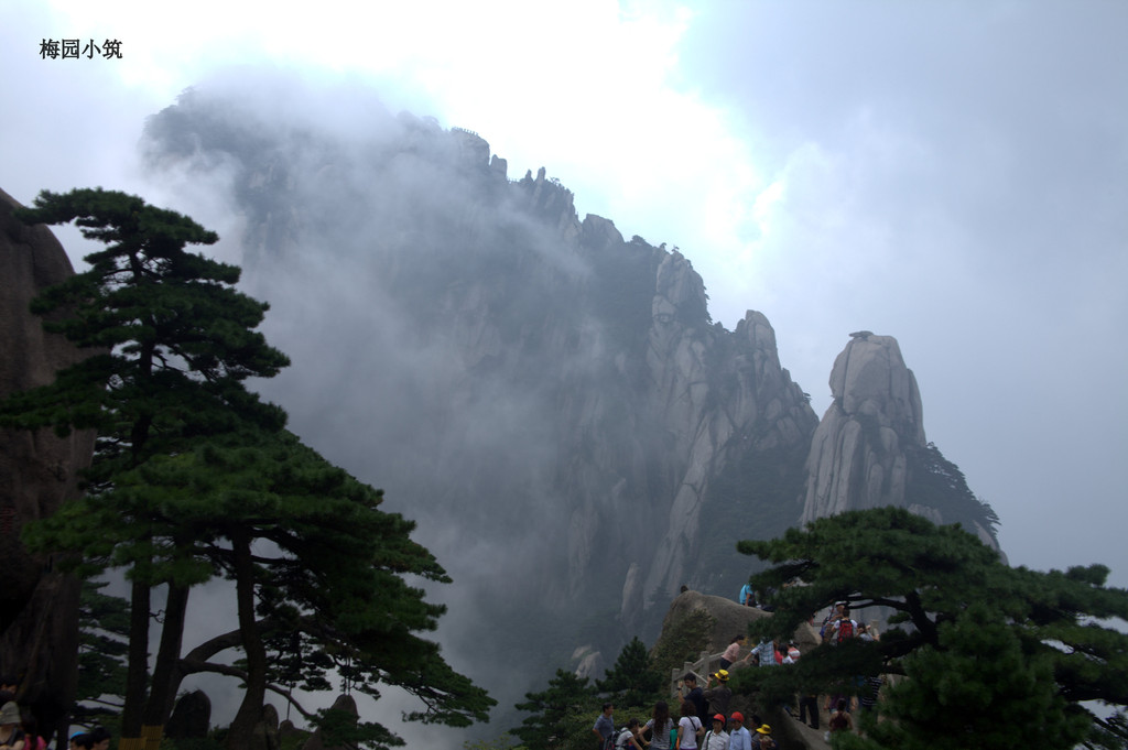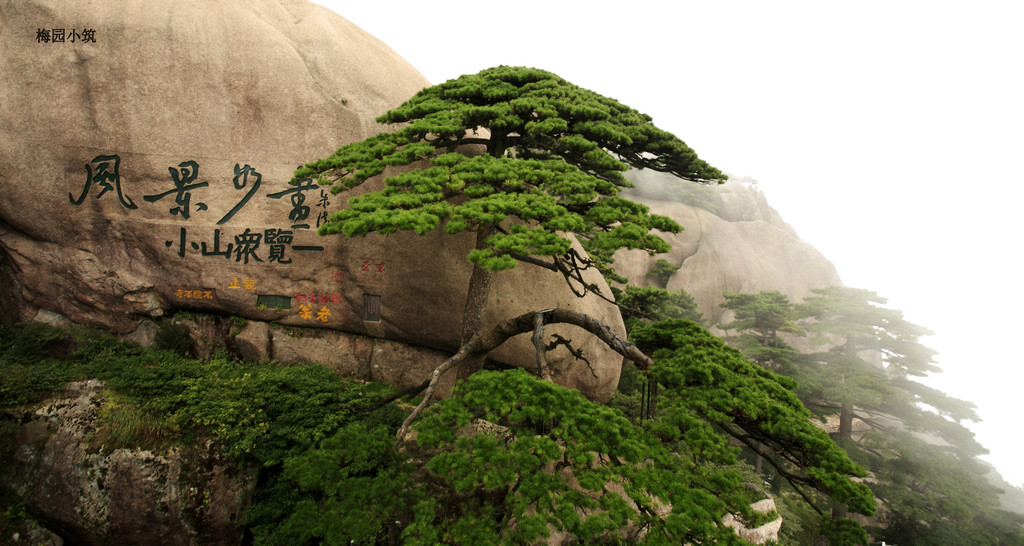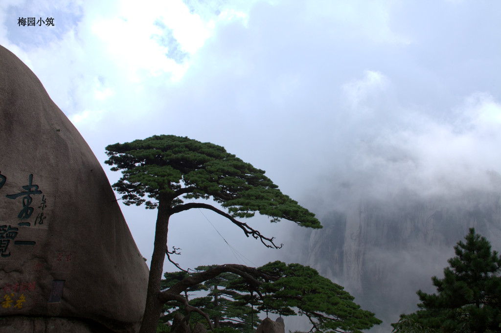 就 这样走着,看着,不知不觉就到了迎客松,这可是黄山的标志性景观!但见迎客松破石而生,一侧枝桠伸出,说是如人伸出臂膀欢迎远道而来的客人,一点儿也不夸 张,更何况他的姿态是如此的雍容大度,姿态优美。可是这迎客松远观可矣,千万不可近览。不必说那个所谓的最佳摄影点儿,人声鼎沸,人挨人,人挤人,堪比北 京的王府井,上海的淮海路;不必说来自四面八方的人们为了能在那里留下一张倩影,不惜排上十分钟的队,吵吵闹闹成一团,你推我搡;单单看到那山壁上不少所 谓的名人题字,不过是“江山如此多娇”、“妙境”等等,就已经倒了胃口。我看不出那书法水准是否如迎客松一样潇洒飘逸,我只知道还是做名人好啊,那样,可 以堂而皇之地信手涂鸦,还有无数人在叫好。