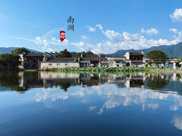 一进门,就与南湖撞了个满怀。水平如镜的湖面上,清晰地倒映着一排粉墙黛瓦的徽派建筑。再加上水面娇羞的莲花,岸边摇曳的垂柳,村后挺立的群山,空中飘逸的白云,终成一幅生趣盎然的水彩画。