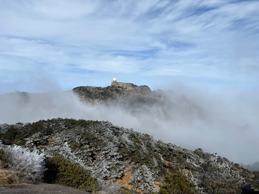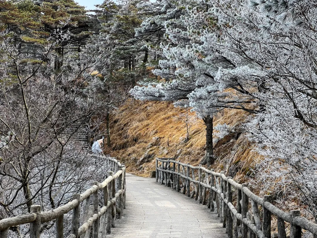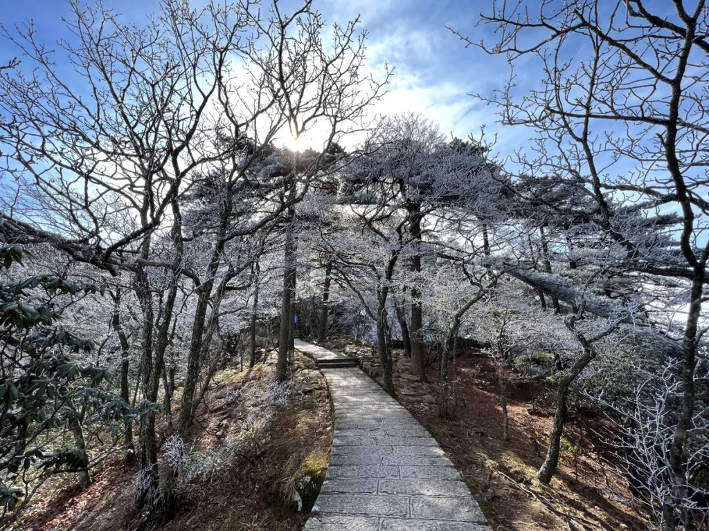 我去的时候前几天刚下过雪,一路上到处都能看到晶莹剔透的雾凇。上山路上时不时出太阳,爬在我前面的陌生小姐姐还喊我回头看阳光下亮晶晶的雾凇,结果顺势化来一阵雨淋在了我的身上。