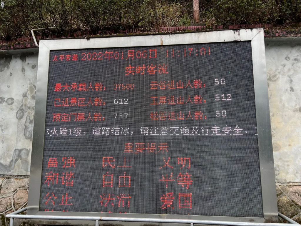 这个季节的黄山是当地的旅游淡季,但车开在街上,发现这里也太过冷清了些。去爬黄山的一路上,几乎没有看到人和车。等到了景区,只有我和朋友通过一层层安检,准备坐摆渡车去景区。像黄山这样的旅游大IP,当天上山的也只有寥寥六百多人。