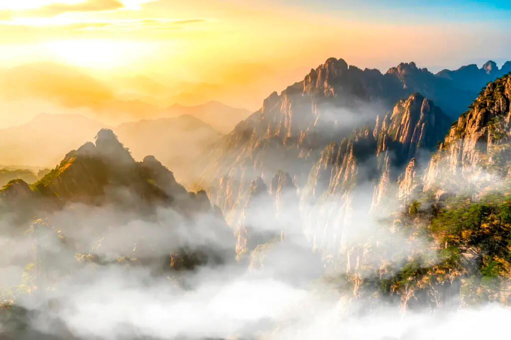 黄山云海主要由黄山云海是由低云和地面雾形成。每年的11月到第二年的5月是观赏黄山云海的最佳时间段,尤其是雨雪天之后,逢日出及日落之前,云海最为壮观。