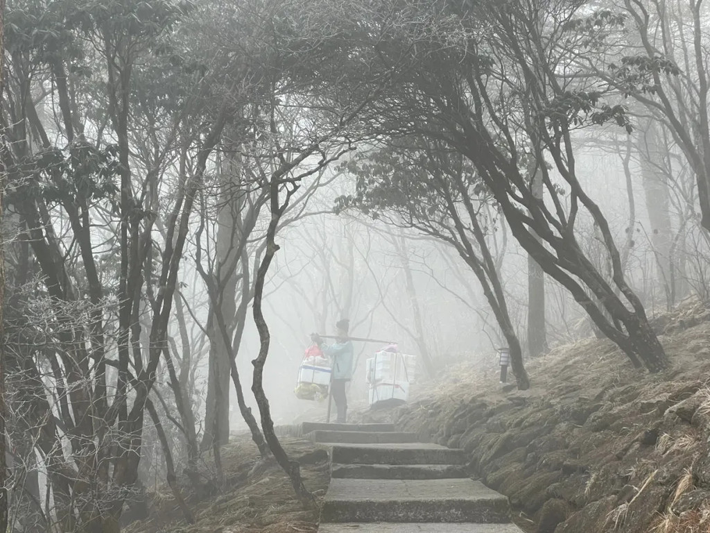 一路上遇到不少挑夫,背着住客上下山的行李、山上换下来的布草、酒店里的食材和日用品、游客扔下的垃圾……时不时歇歇脚的挑夫和我常常交替走在前面,最后远远地被我甩在身后。