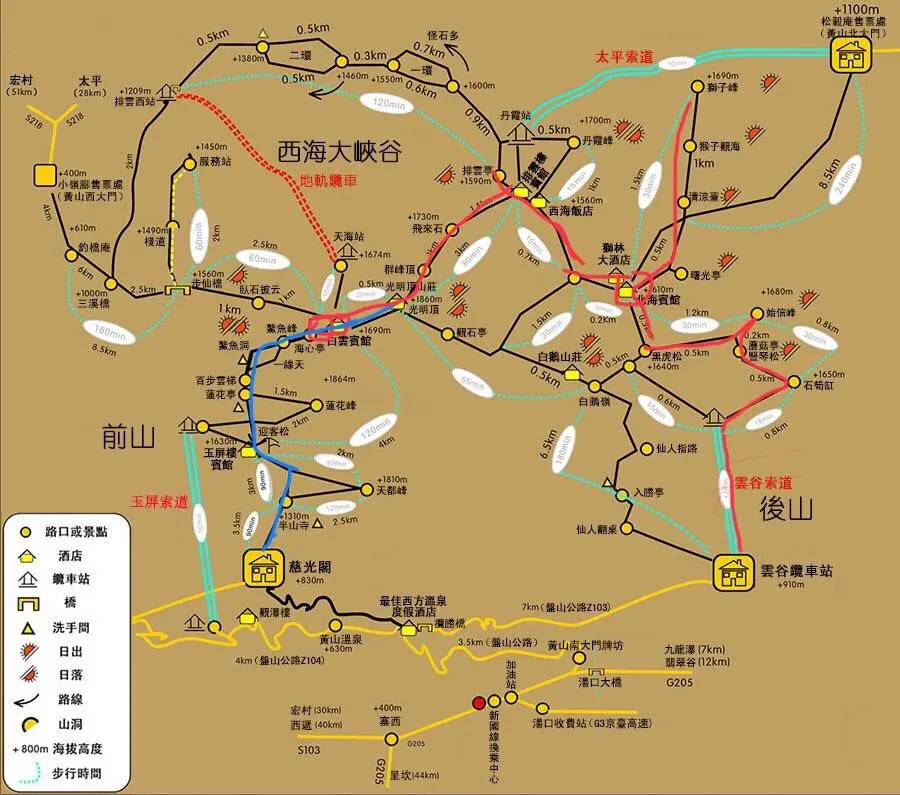 我们11点进山,为了赶在缆车结束前可以下山,一路跳了不少景点。如果最近正好要去,可以参考我们走的线路: