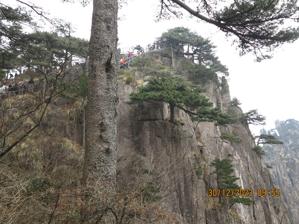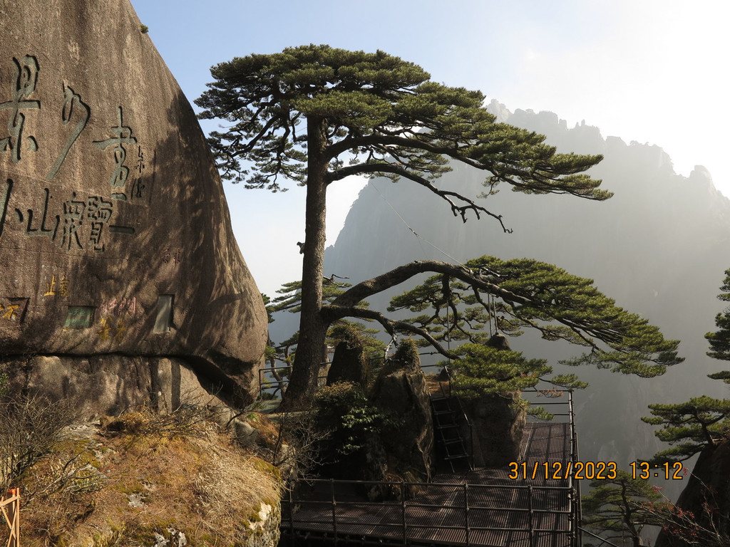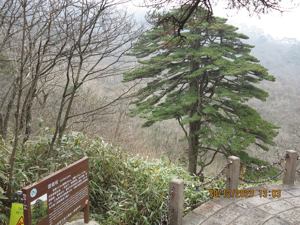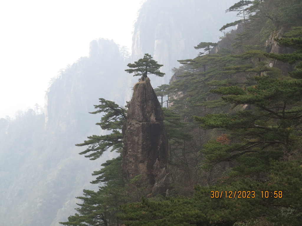 连滚带爬下了始信峰,不远就是梦笔生花,标志景点。这里位于北海散花坞左侧,有一孤立石峰,形同笔尖朝上的毛笔,峰顶巧生奇松如花,故名“梦笔生花”。据说这个梦笔是李白的笔。这个笔还有个故事,1982年,黄山风景区这棵几乎与国宝迎客松齐名的黄山古松开始枯萎,最后彻底死亡。这对于黄山风景区管委会园林局来说,是天塌下来的大事。情急之下,用了一棵仿真树代之,一代就是17年。后来在时任园林局局长李金水的努力下,2004年重新选植了一棵黄山松到梦笔生花原来扰龙松位置,并养护成功。梦笔生花胜景终于恢复到自然的面貌。