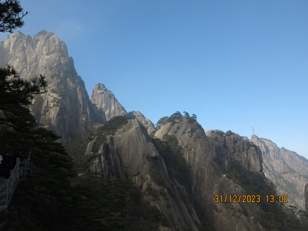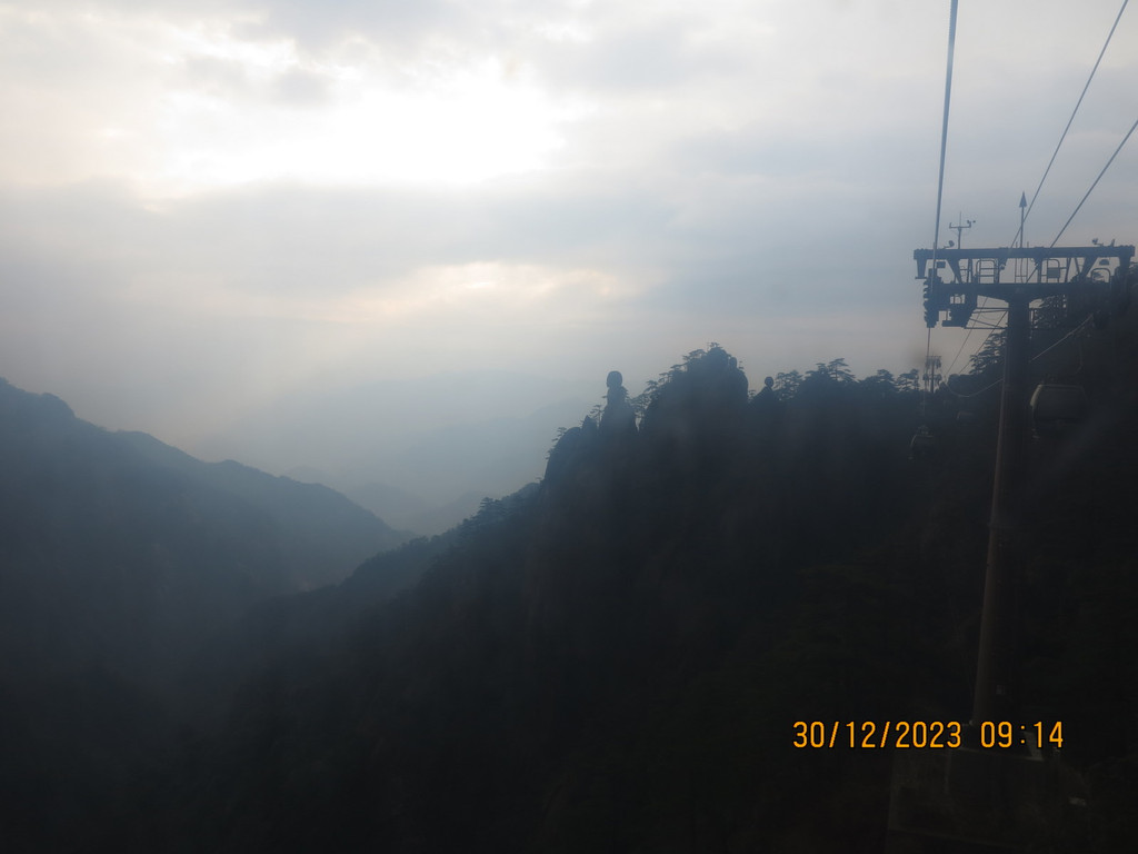 第二天:一早退房,车停在酒店,轻装徒步去换乘中心。20分钟步行,网上提前买好所有的票,刷身份证直接换乘,黄山的管理还是很不错的,景交车半个小时直达云谷寺,没有了二十年前步行上山的勇气和体力,直接索道上山,黄山是世界遗产,山体是花岗岩,索道两侧山体陡峭,但这里的黄山松真的是绝壁生长,而且这里大部分都是松树,真的是一绝。
