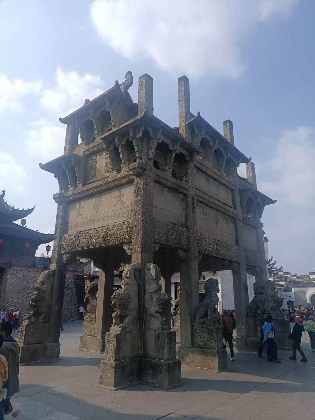 许国石坊 又名大学士坊,立于明万历十二年(公元1584年),是我国仅有的一座八脚牌楼,有八根柱子,横截面呈“口”字型,是立体的结构,外部的四个面和内部的四个面都可以观摩,柱脚有十二只石狮坐镇,上部的石雕精美绝伦。