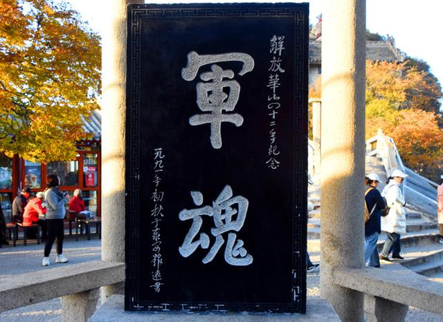 在北峰今真武殿前百米处缆车站建有一座六角攒顶飞檐斗拱华山花岗岩圆雕石亭,亭中立有一座《军魂》的石碑矗立在此。这也是为纪念中国人民解放军智取攻克华山的历史见证。1949年,华阴解放前夕,国民党陕西省第八行政督察区专员兼陕西保安第六旅旅长韩子佩率残部百余人逃上华山,妄图凭借天险负隅顽抗作最后挣扎。