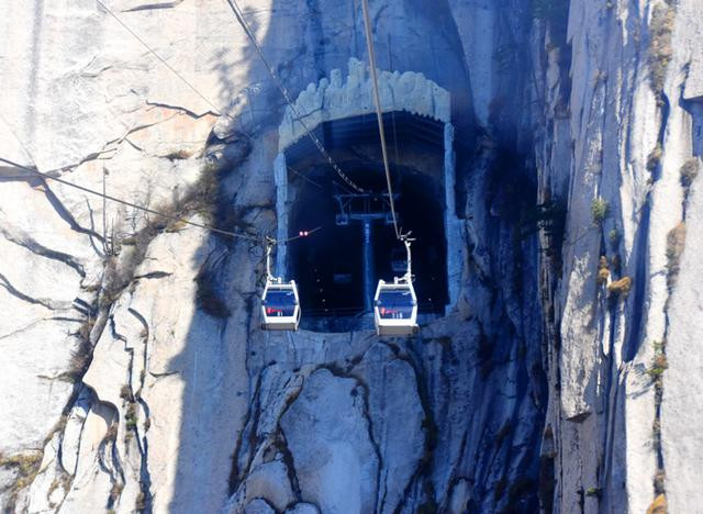 不过已经如此,只能既来之则安之,还是先感受视觉中的华山大美风光吧。在长达半小时左右上下起伏的缆车,在好像失重的刺激中兴奋异常。与此同时,透过车窗尽享了华山雄奇险峻的大美风光。