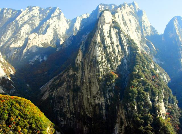 西峰为一块完整巨石,浑然天成。西北绝崖千丈,似刀削锯截,其陡峭巍峨、阳刚挺拔之势是华山山形之代表,因此古人常把华山叫莲花山。由于光照原因,下午时分,一些山峰被阳光遮住,拍出的效果明显对比较为强烈,故效果不是太好。