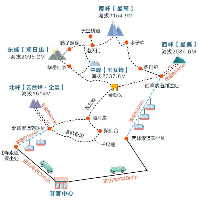 华山地图如上图。我是旺季去的,华山门票+西峰观光车合起来200元,西峰索道单程140元,西峰观光车大约要开40分钟,西峰索道约25分钟,加上买票排队时间,大约9点钟登上了华山西峰。