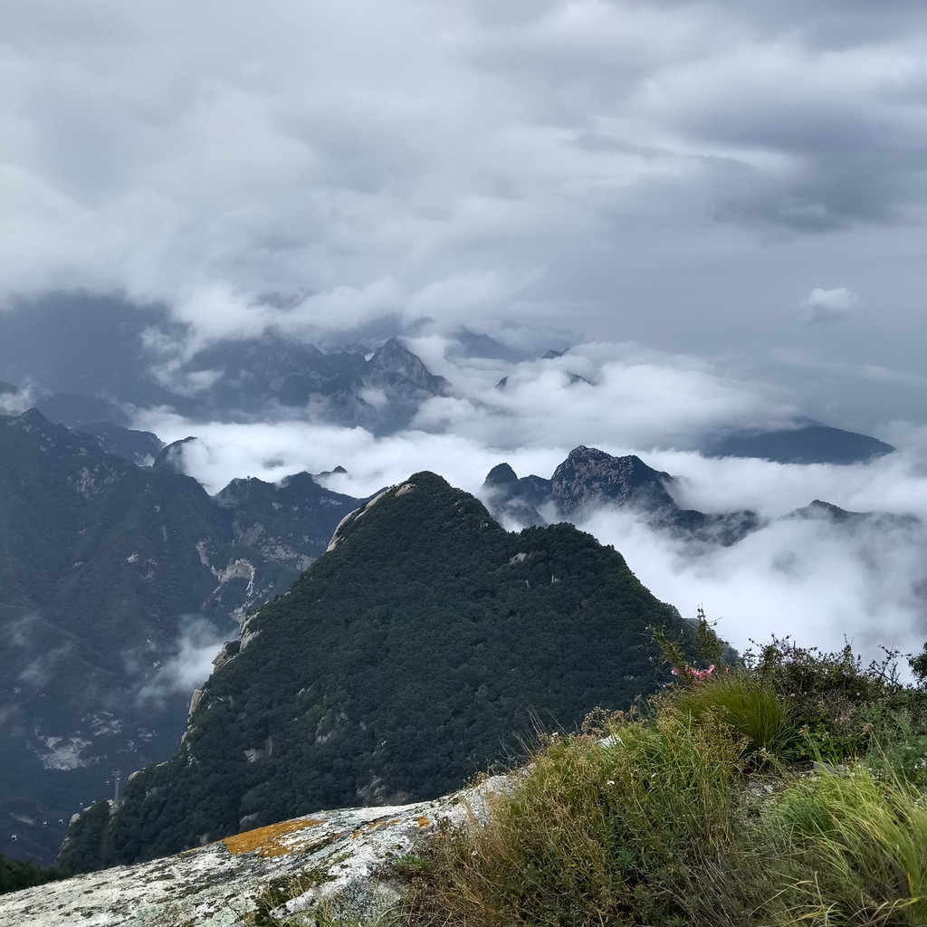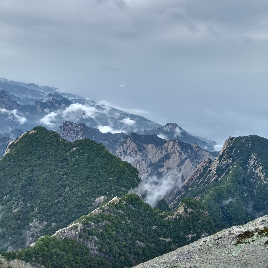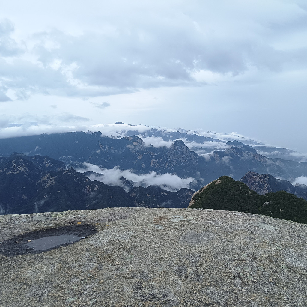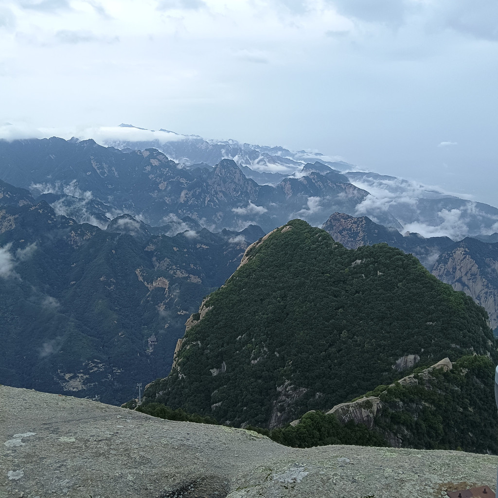 华山天下险,名副其实。我们登上了西峰顶,登山途中亲眼目睹了两个游客因雨天路滑跌倒,好在没有大碍。