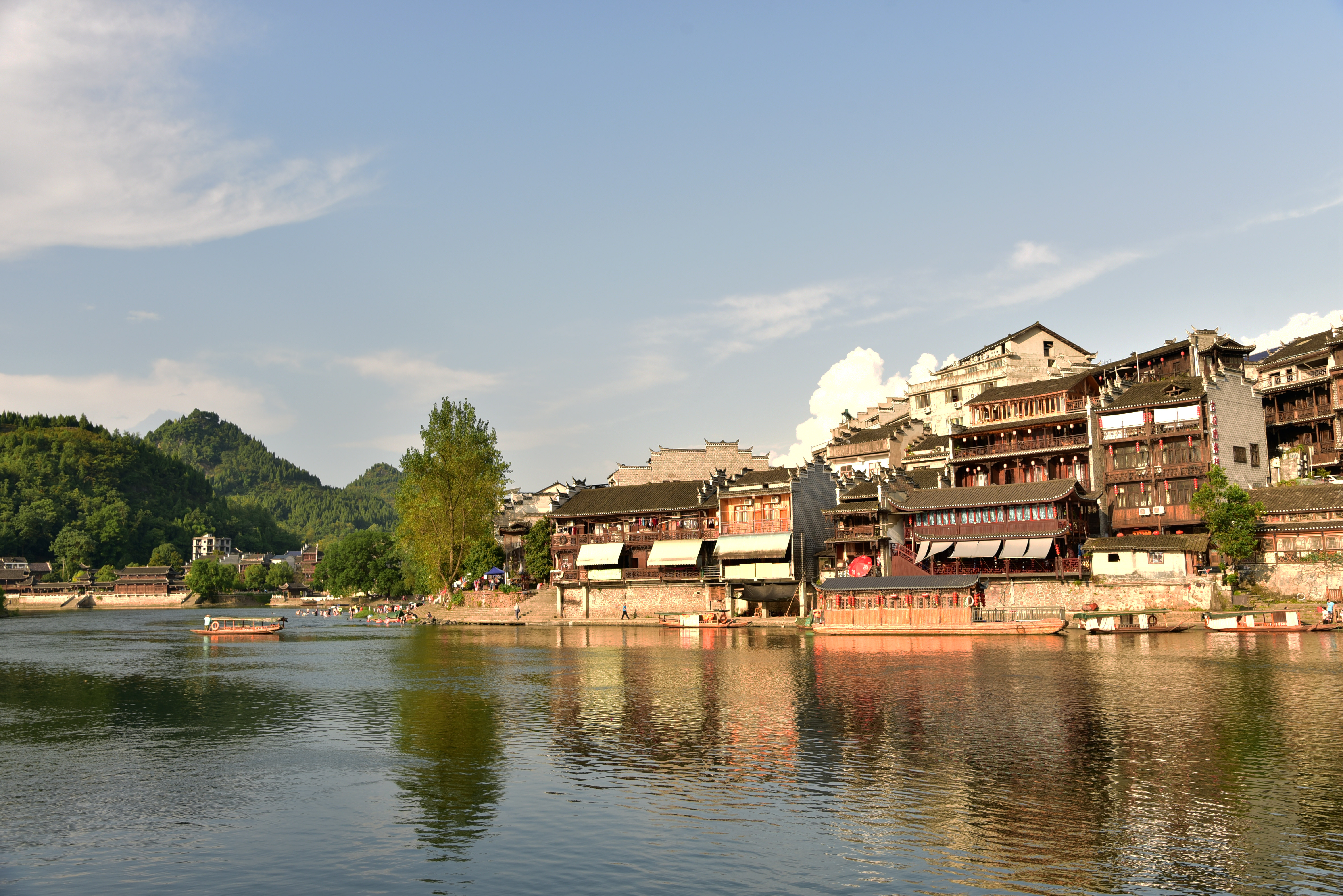 西下的太阳照耀着花垣河东岸的边城,金黄温暖,宁静安详。从湘渝黔交界的鸡鸣三省亭归来的小船载着游客的满足和船家的收获慢慢靠岸,画出一圈圈漂亮涟漪。该回去了。真想跳上拉拉渡船,手拉钢索,漂向对岸的边城。